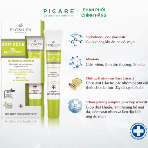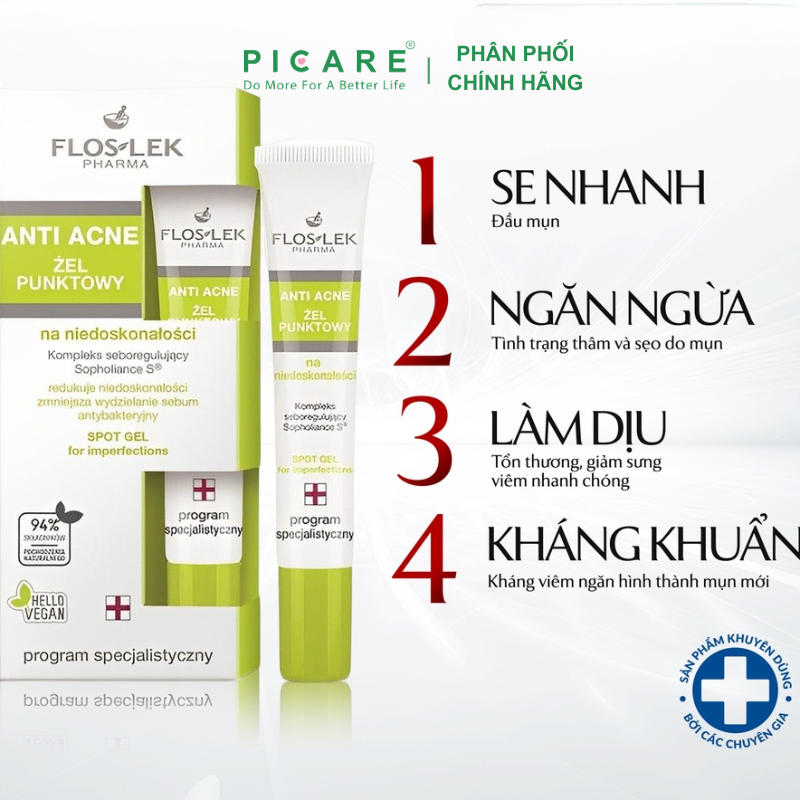 Gel Giảm Mụn & Diệt Khuẩn Floslek Anti Acne Antibacterial Intense Gel 20ml với chất gel lỏng trong suốt, sản phẩm thấm rất nhanh trên da mình và mang đến cảm giác mát lạnh dễ chịu. Đặc biệt trong thời tiết nóng ẩm thế này, nhờ kết cấu mỏng nhẹ, sản phẩm không gây nhờn dính khó chịu trên da. – Picare là nhà phân phối chính hãng của Floslek tại Việt Nam.