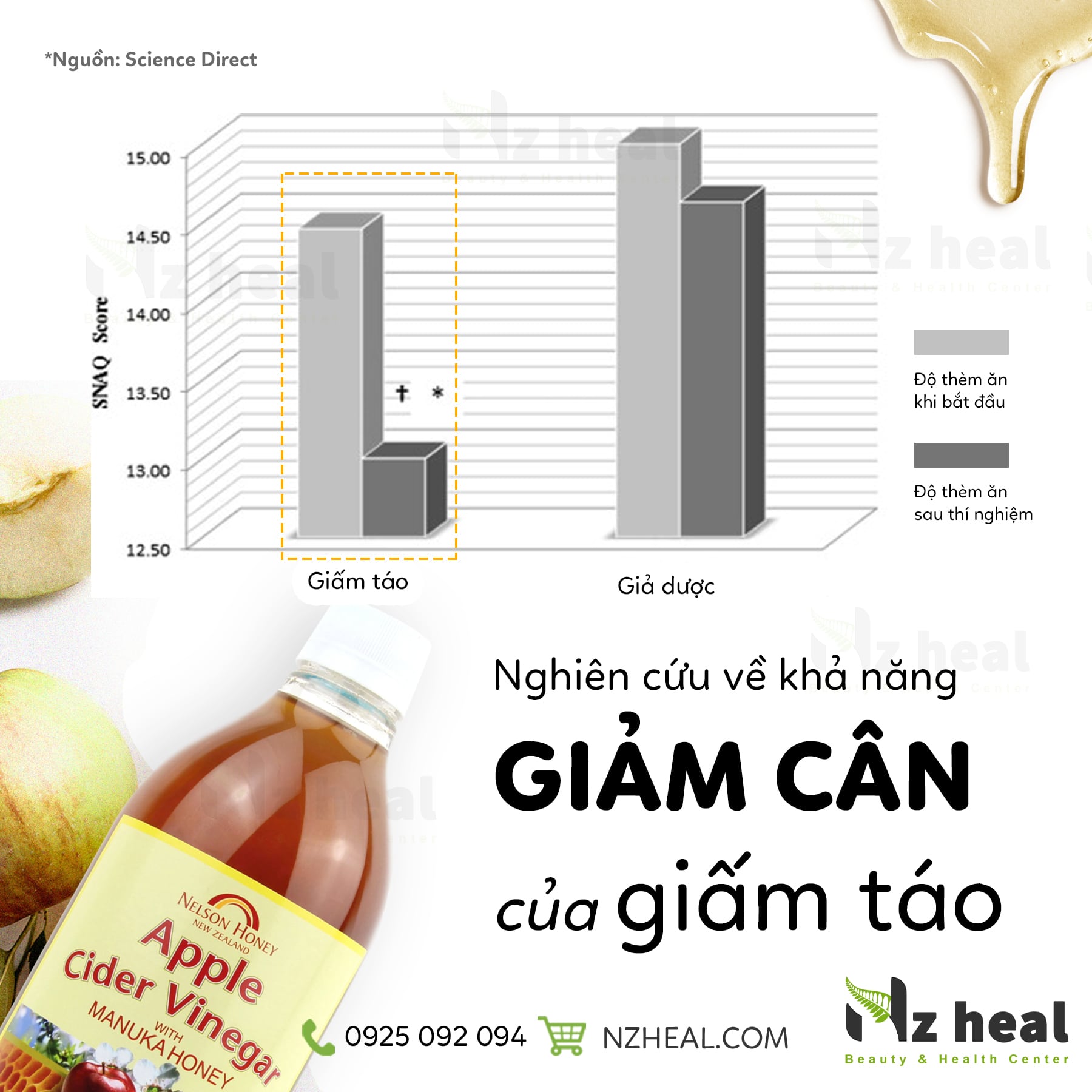 Theo nghiên cứu, axit axetic trong giấm táo Nelson có tác dụng hỗ trợ giảm cân rất hiệu quả. Nó có tác dụng làm chậm quá trình hấp thụ chất dinh dưỡng vào máu, tạo cảm giác no lâu và giảm cảm giác thèm ăn.