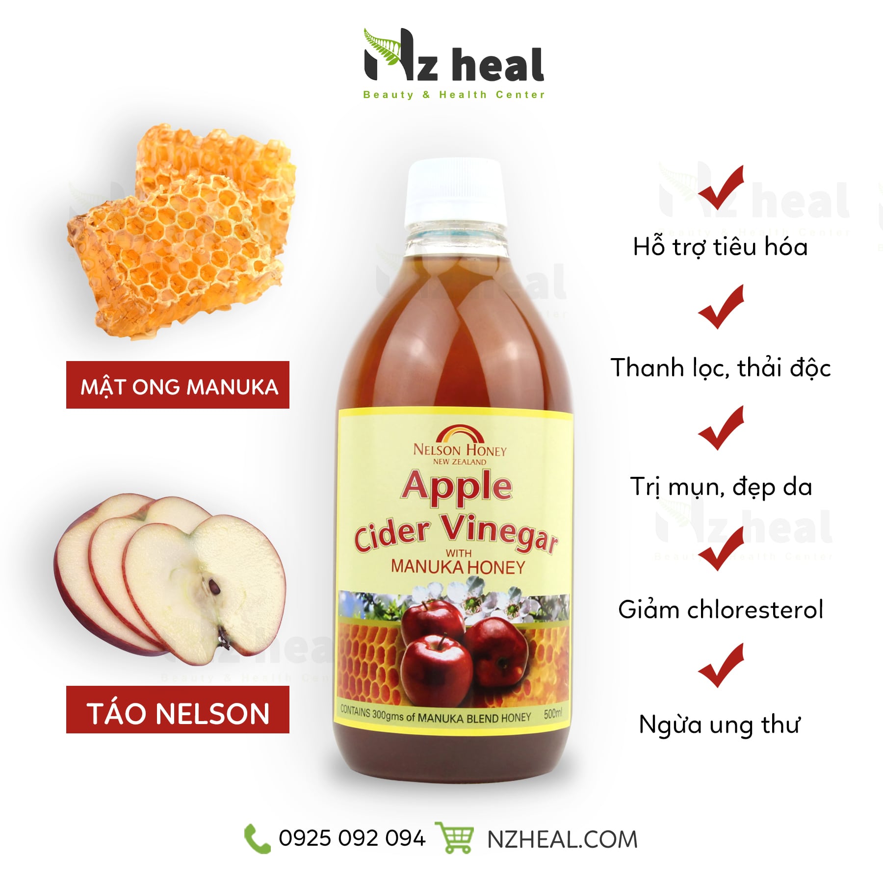 Thành phần tự nhiên: Giấm táo lên men tự nhiên làm từ Táo Nelson, Mật ong Manuka đa tuyến.