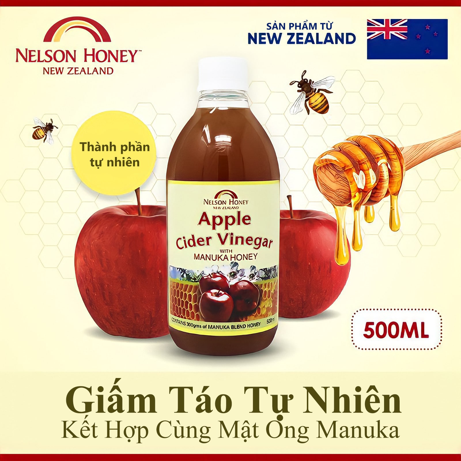 Giấm táo lên men tự nhiên làm từ Táo Nelson, Mật ong Manuka đa tuyến.