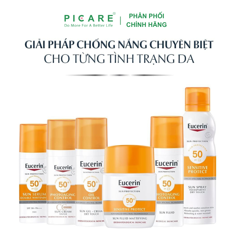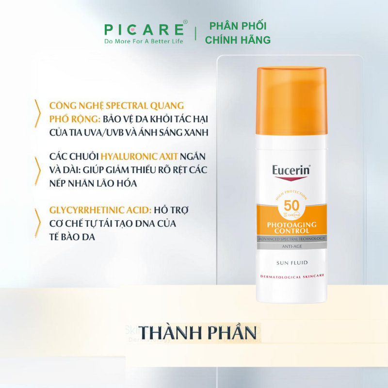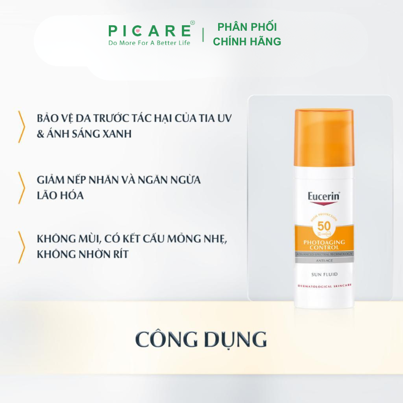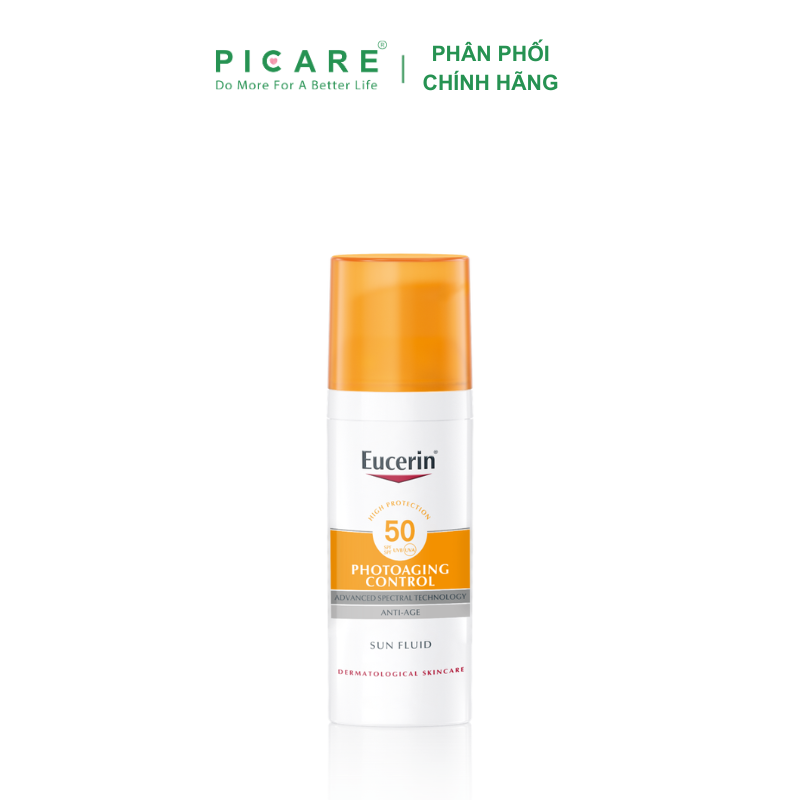 - Eucerin Sun Fluid Photoaging Control SPF 50 là một kem chống nắng hàng ngày cho mọi loại da. Các quang phổ công nghệ tiên tiến kết hợp UVA photostable và bộ lọc UVB 1 để bảo vệ da khỏi tia cực tím cao .