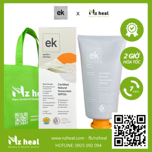 Mạnh mẽ về khả năng bảo vệ và nhẹ tênh trên da, kem chống nắng Kawakawa Sunscreen SPF50 của Earth’s Kitchen tự hào được chứng nhận tự nhiên với 100% thành phần hữu cơ. EK Kawakawa Sunscreen tạo ra một lớp màng bảo vệ vô hình cho da khỏi ánh nắng mặt trời với chỉ số chống nắng thực tế SPF68 và không chứa hóa chất. Được nghiên cứu hoàn thiện trong 20 năm và bào chế bởi y tá – nhà thảo dược học Jules Bright, kem chống nắng của Earth’s Kitchen tích hợp khoa học cùng các thành phần tự nhiên có hoạt tính mạnh mẽ.