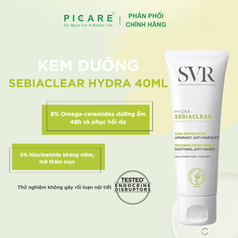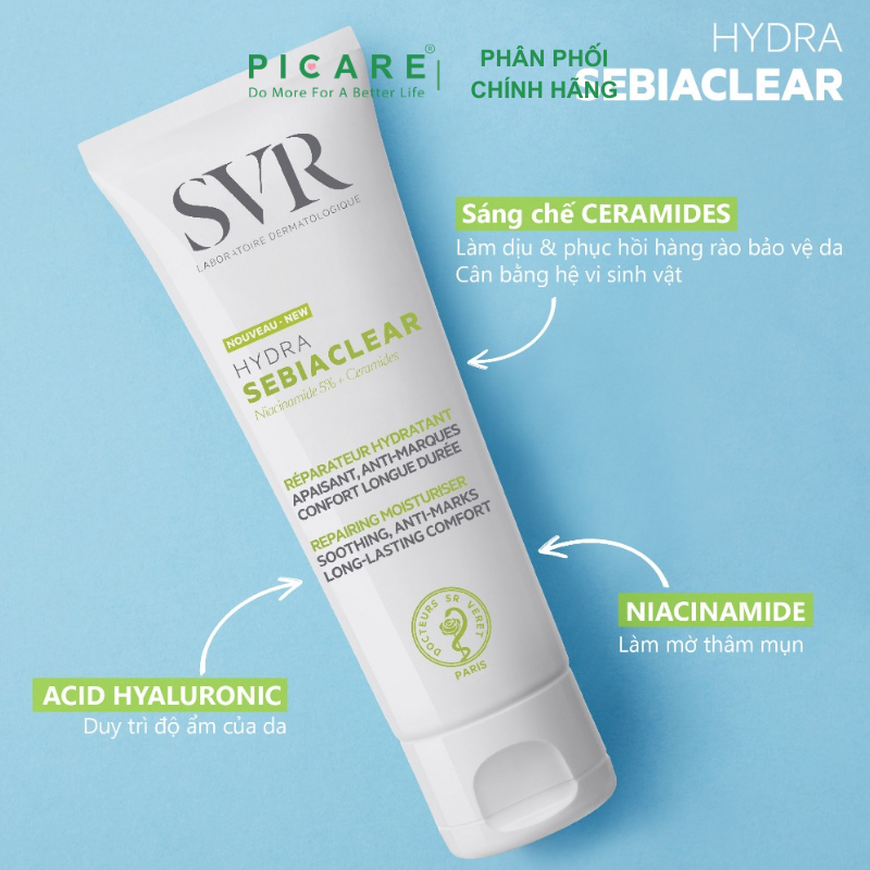 – SVR Sebiaclear Hydra 40ml không chỉ là một loại kem dưỡng ẩm đơn thuần, mà sản phẩm còn giúp phục hồi làn da sâu từ bên trong, đồng thời chống lại các vết thâm, đỏ do mụn để lại.