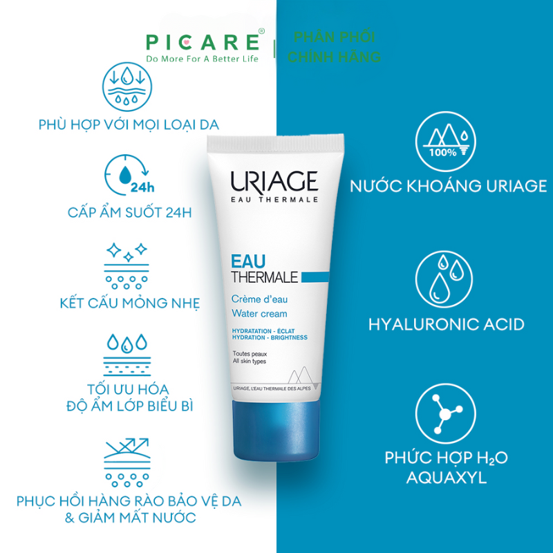 Kem Dưỡng Ẩm Khoáng Chuyên Sâu Dạng Kem Nước Uriage Eau Thermale Creme D’Eau 40ml dạng Water cream, siêu mỏng nhẹ và siêu thấm nhanh, giúp truyền phức hợp dưỡng ẩm độc đáo vào da ngay mà không nhờn rít, tăng cường và phục hồi độ ẩm, bảo vệ da ngăn mất nước, cho làn da hồi sinh, tươi sáng, mềm mại, và vẻ ngoài rạng ngời cả ngày. 90% người sử dụng cho biết sản phẩm dưỡng ẩm sâu làn da trong suốt ngày dài – Picare là nhà phân phối chính hãng của URIAGE tại Việt Nam.