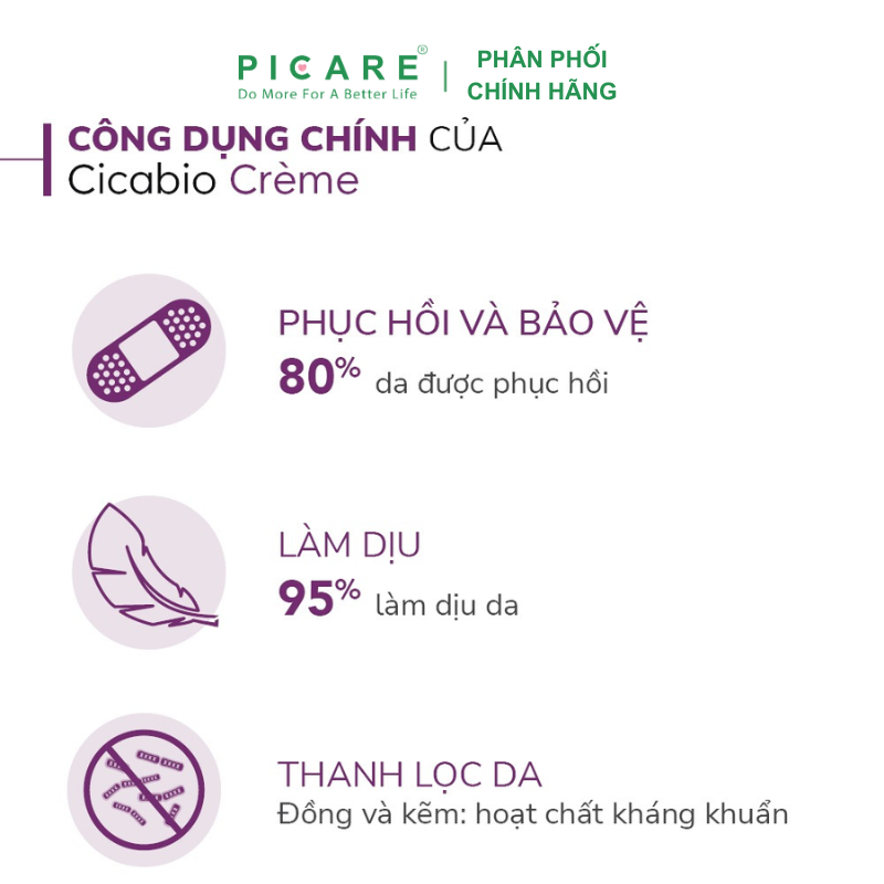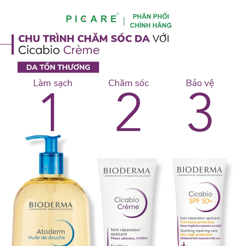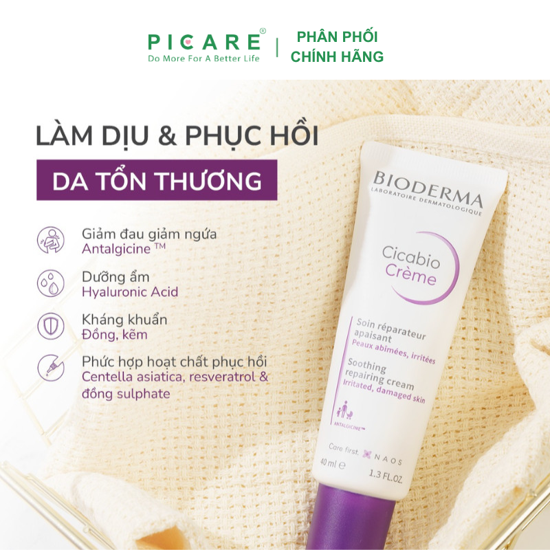 Kem Dưỡng Ẩm Phục Hồi Và Làm Dịu Da Cicabio Crème giúp phục hồi làn da bị kích ứng bằng cách tác động vào từng giai đoạn của quá trình tái cấu trúc sinh học của lớp biểu bì. Kem Dưỡng Ẩm Phục Hồi Và Làm Dịu Da Cicabio Crème bao gồm sự kết hợp hiệp đồng của các thành phần resveratrol, đồng và centella asiatica sẽ đẩy mạnh khả năng phục hồi của làn da, kẽm giúp ngăn chặn sự phát triển của vi khuẩn và thành phần Antalgicine™ nhanh chóng làm dịu cảm giác khó chịu và giảm thôi thúc muốn gãi.– Picare là nhà phân phối chính hãng của BIODERMA tại Việt Nam.