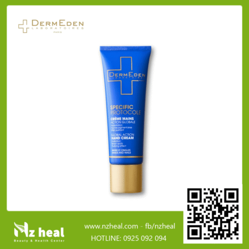 Kem dưỡng da tay DermEden Global Action Hand Cream chứa 5% Niacinamide grade S và 1% Dioic Acid, giúp ngăn chặn và làm mờ các đốm nâu trên tay. Ngoài ra, kem dưỡng da tay DermEden còn có tác dụng chống lão hóa nhờ 1% Hyaluronic Acid, kích thích sản xuất collagen, giảm sự xuất hiện của nếp nhăn. DermEden Hand Cream cũng chứa Chlorhexidine và Zinc, có tính kháng vi khuẩn, bảo vệ tay khỏi vi khuẩn và nhiễm trùng.