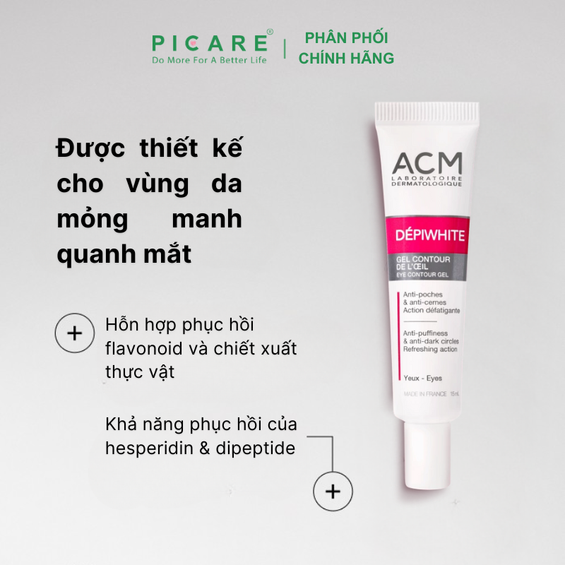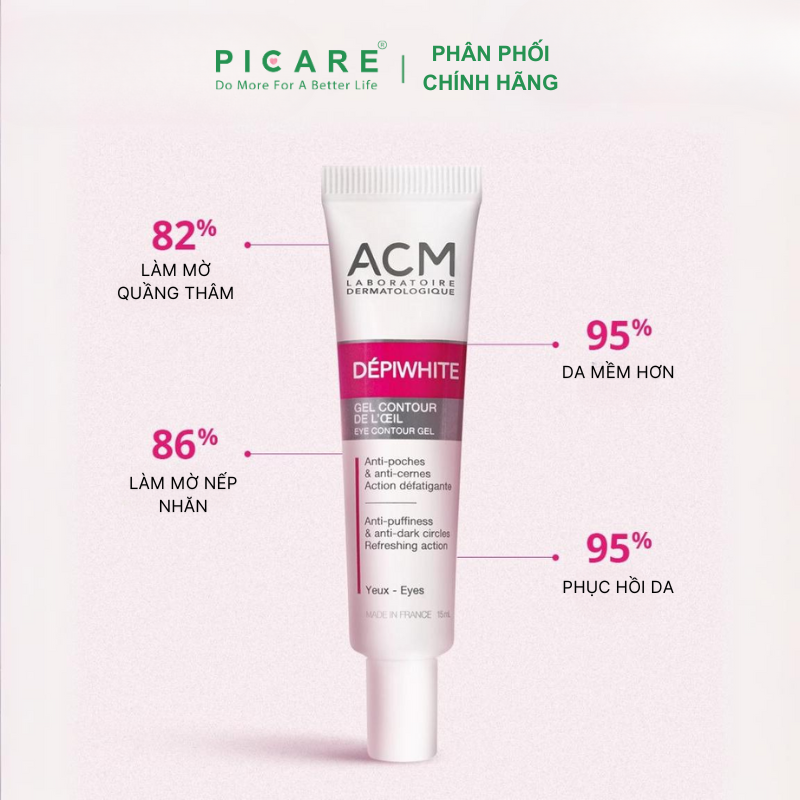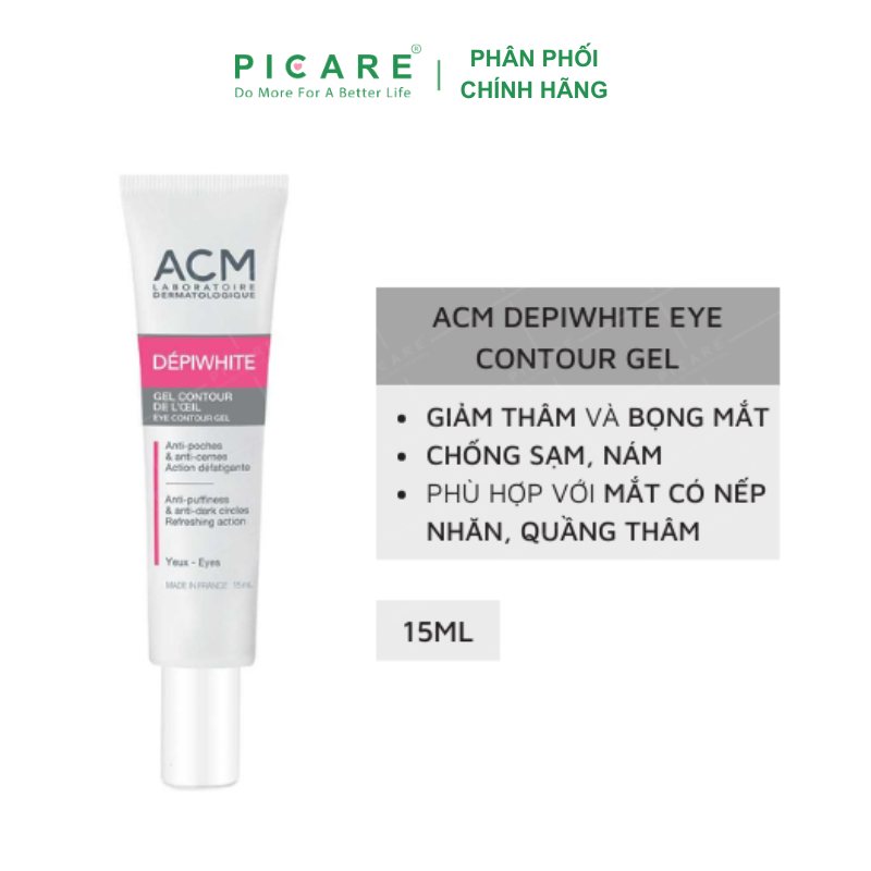 – Gel Depiwhite Eye Contour ACM giúp giảm thâm và bọng vùng mắt, giúp đem lại sự trẻ đẹp cho đôi mắt và cả làn da.