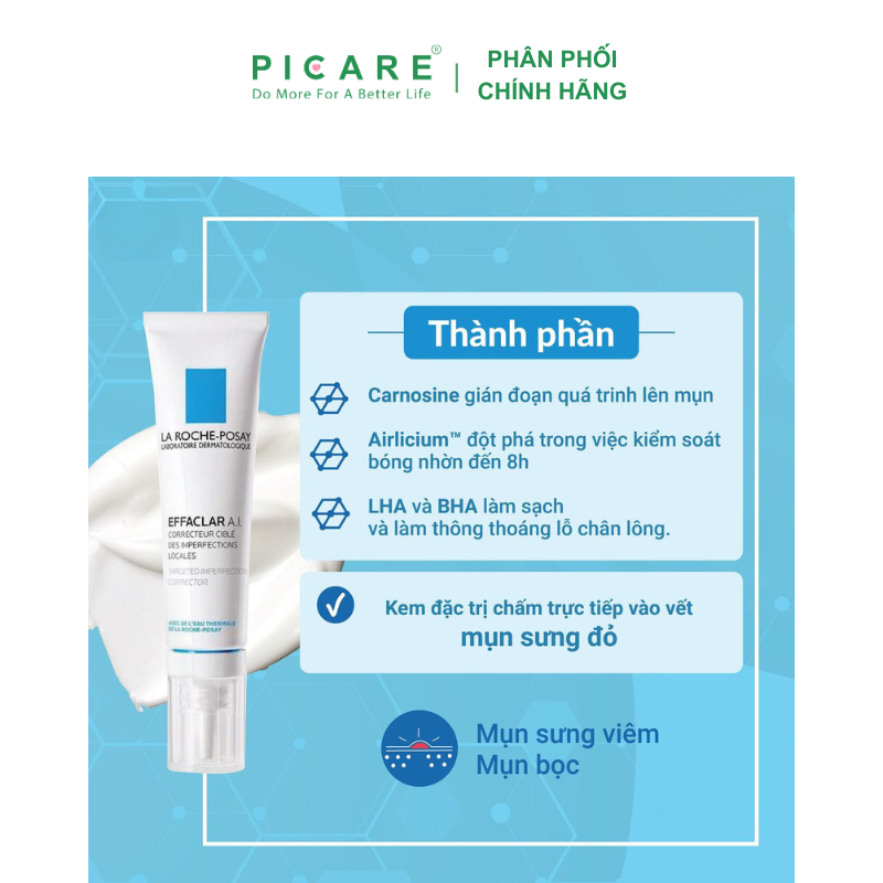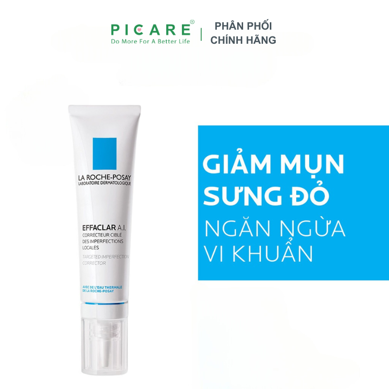 Kem Duỡng Giảm Mụn La RochePosay Effaclar A.I. 15ml giúp làm sạch sâu, giảm sưng viêm & ngăn ngừa sự phát triển của vi khuẩn gây mụn, đồng thời giúp ngăn ngừa sự hình thành của các vết thâm sau mụn. Picare là nhà phân phối chính hãng của La Roche-Posay tại Việt Nam.