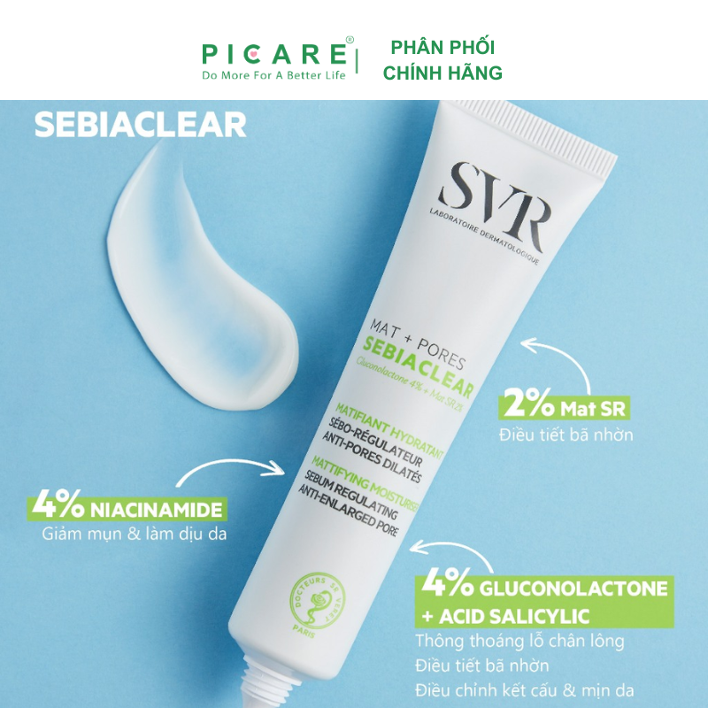 Kem dưỡng da làm giảm mụn, thông thoáng lỗ chân lông Mat+Pores giúp dưỡng ẩm, thu nhỏ lỗ chân lông và giảm bã nhờn trên da trong vòng 8 giờ. Hiệu quả tẩy da chết dịu nhẹ không chứa AHA với độ dung nạp tối ưu giúp cải thiện chất da và điều tiết lượng bã nhờn dư thừa. Dành cho da hỗn hợp đến da dầu nhạy cảm. – Picare là nhà phân phối chính hãng của SVR tại Việt Nam.