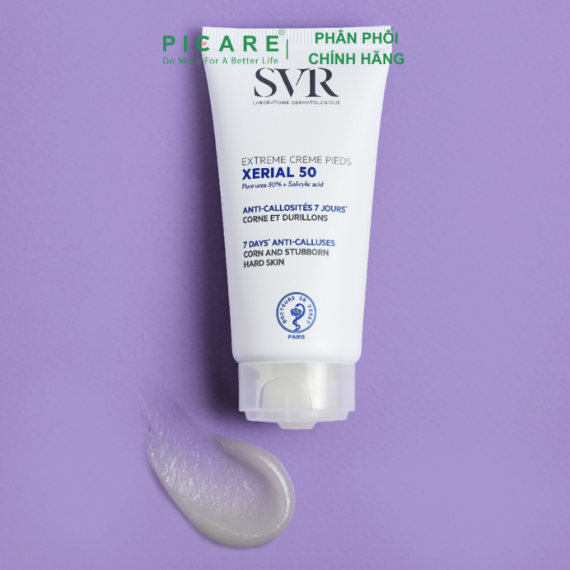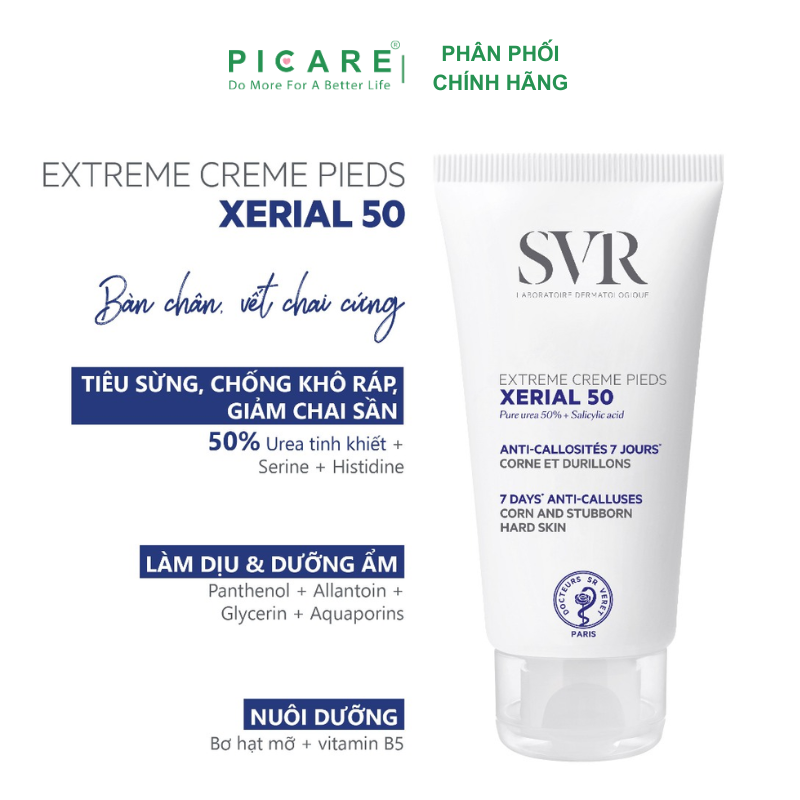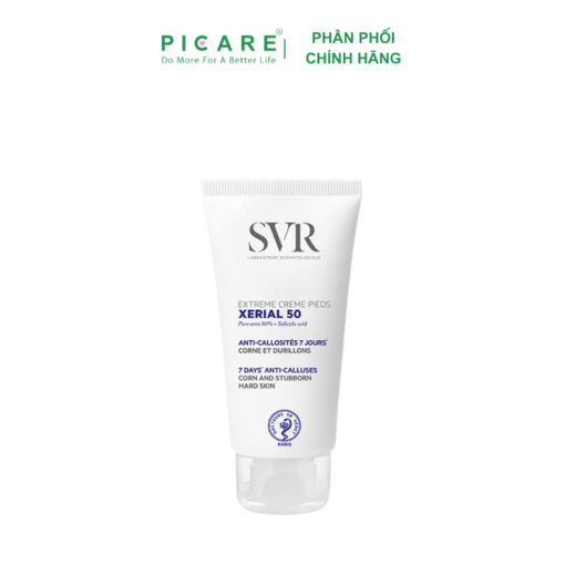 Kem dưỡng da tay và chân SVR Xerial 50 Extreme Creme Pieds 50ml: Kem giúp giảm các vết chai thường và khó chữa chỉ trong vòng 7 ngày*. Ngoài ra, kem còn có tác dụng trên vùng da dày ở bàn tay và khuỷu tay. Được điều chế riêng cho bàn chân. Kem Xerial 50 có thể loại bỏ sừng da tương tự như đá bọt mà không gây chai sần trở lại. Có tác dụng với cả các vết chai ở tay, khuỷu tay, đầu gối. – Picare là nhà phân phối chính hãng của SVR tại Việt Nam.