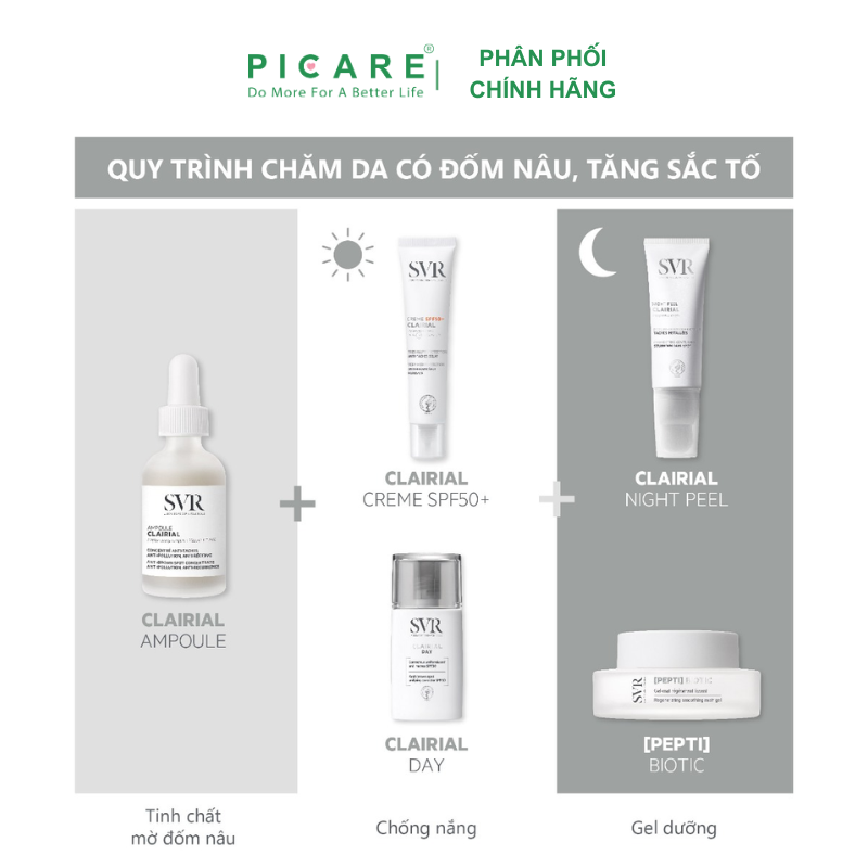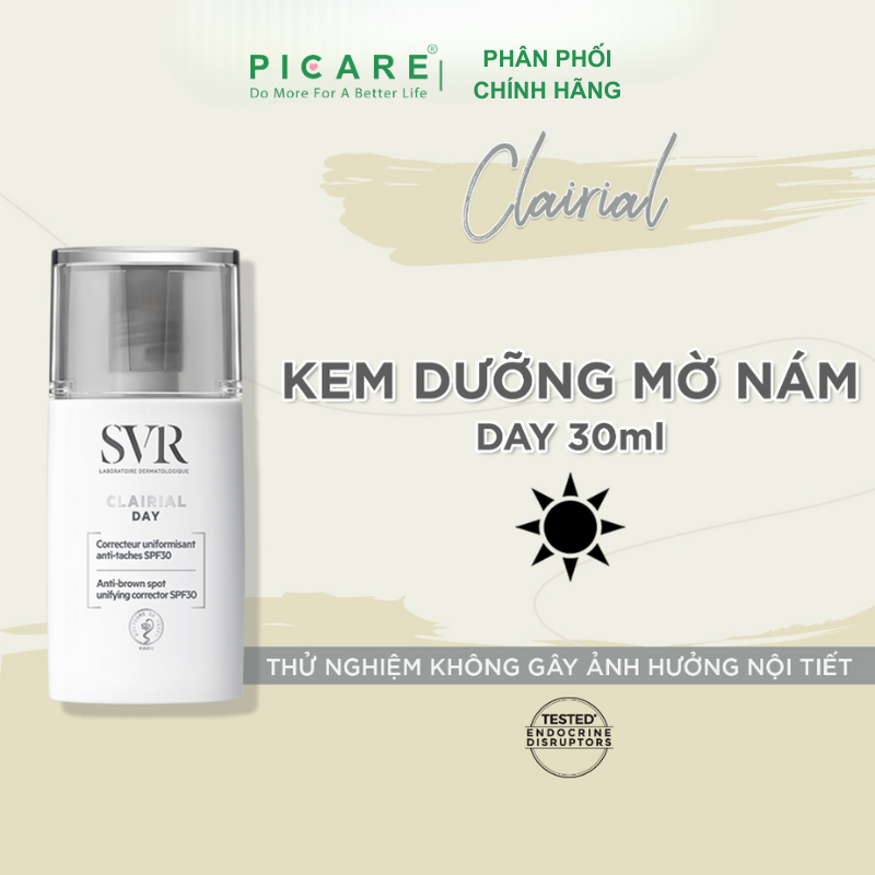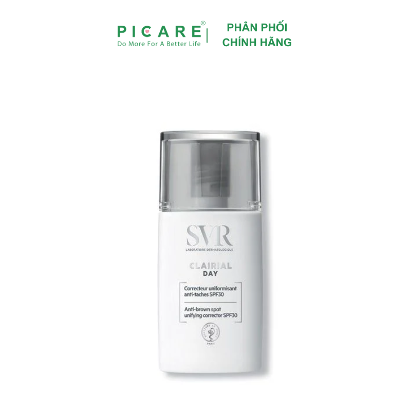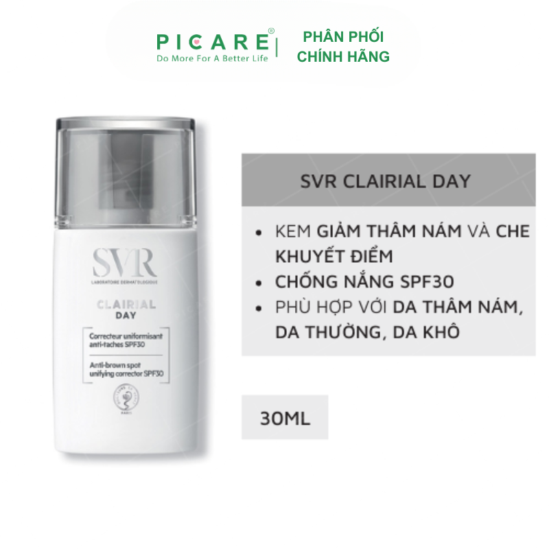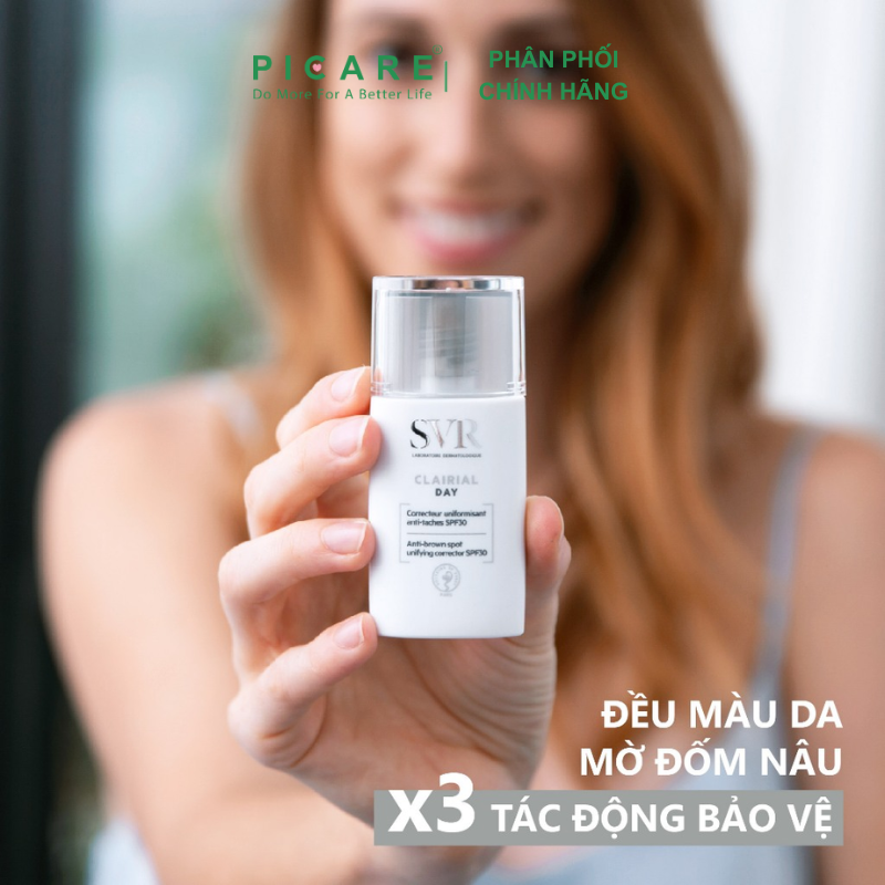 Clairial Day là bộ ba bảo vệ hàng ngày mới: chống tia UVB-UVA, chống ô nhiễm và chống ánh sáng xanh để giảm và ngăn ngừa sự xuất hiện của các đốm nâu. Sản phẩm đồng nhất tông màu da và hiệu chỉnh các dấu hiệu để mang lại làn da sáng và ngậm nước. Ngày qua ngày, các đốm nâu và vết thâm mờ dần, làn da đều màu và rạng rỡ hơn.– Picare là nhà phân phối chính hãng của SVR tại Việt Nam.