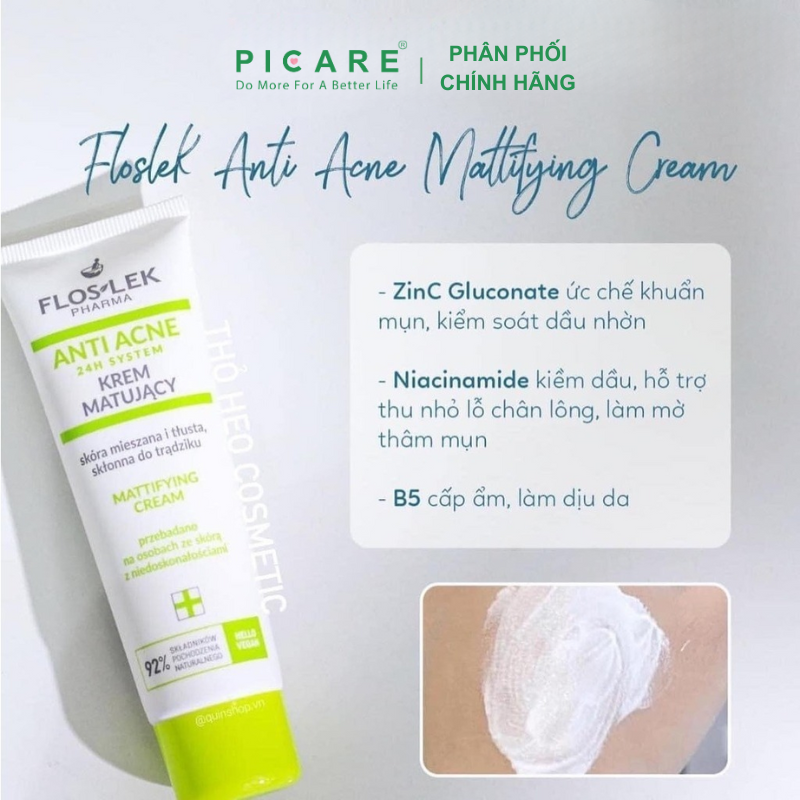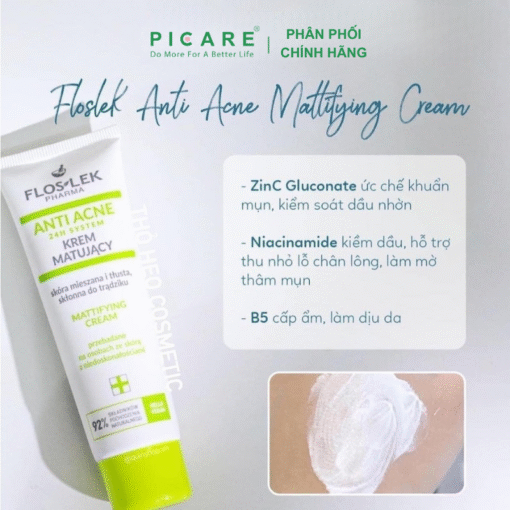 Kem Ngăn Ngừa Mụn Kiểm Soát Dầu & Điều Tiết Nhờn Floslek Pharma Mattifying Cream 50ml thuộc dòng sản phẩm ngừa mụn Anti Acne của thương hiệu Floslek. Floslek Pharma Mattifying Cream chứa chiết xuất cải xoong, rễ ngưu bàng, cây xô thơm, vỏ chanh vàng, thường xuân, tảo gạc hươu và nhiều thành phần thiên nhiên khác giúp da láng mịn, điều tiết lượng dầu và nước trên da, kiểm soát bã nhờn, cho làn da ẩm mượt, mịn màng và không bóng nhờn. – Picare là nhà phân phối chính hãng của FLOSLEK tại Việt Nam.