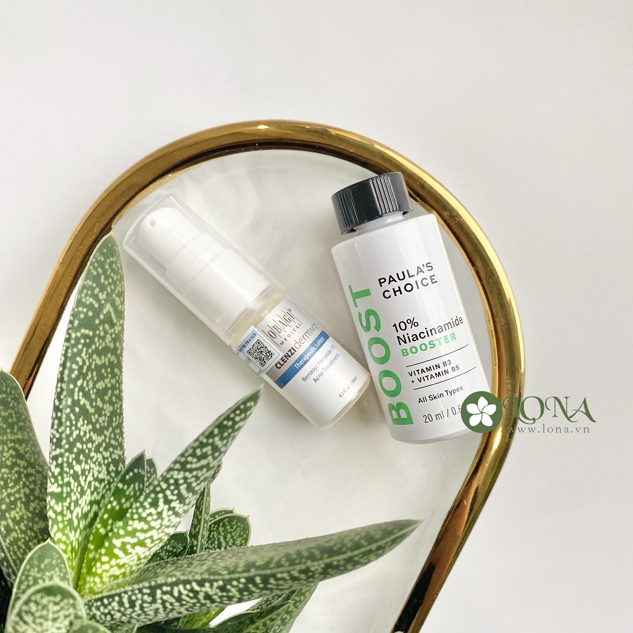 Benzoyl Peroxide là lựa chọn hàng đầu trong routine trị mụn. Nó mang hoạt tính mạnh nhưng là thành phần không cần kê toa. Tuy vậy, hiểu biết và lựa chọn sản phẩm phù hợp vẫn là việc làm cần thiết.Bên cạnh đó, Niacinamide vốn không gây hại gì cho bạn. Là thành phần lành tính nên luôn được săn đón trong routine của nhiều tín đồ. Nhưng, nó vẫn gây cảm giác châm chích nhẹ cho da nhạy cảm. Nên Lona khuyên bạn tìm hiểu kỹ đặc tính sản phẩm để thu về kết quả như ý.