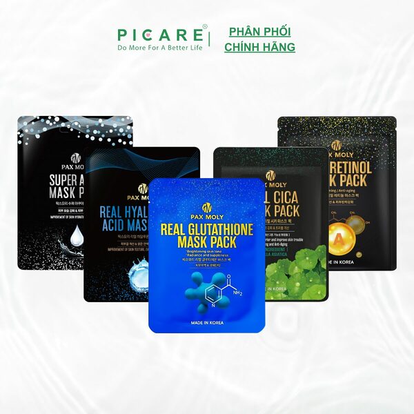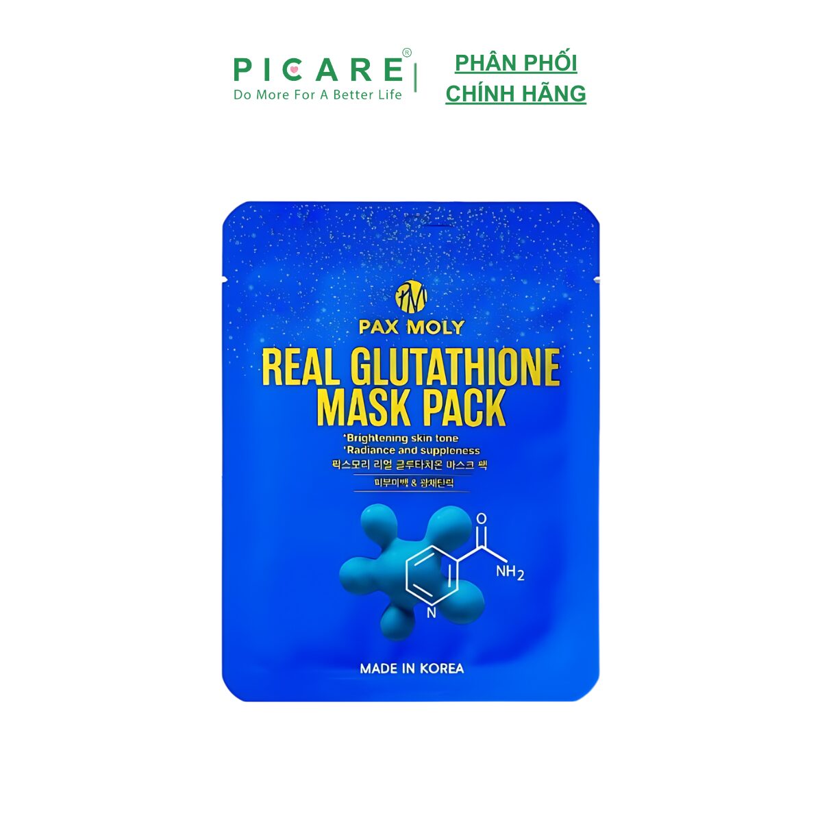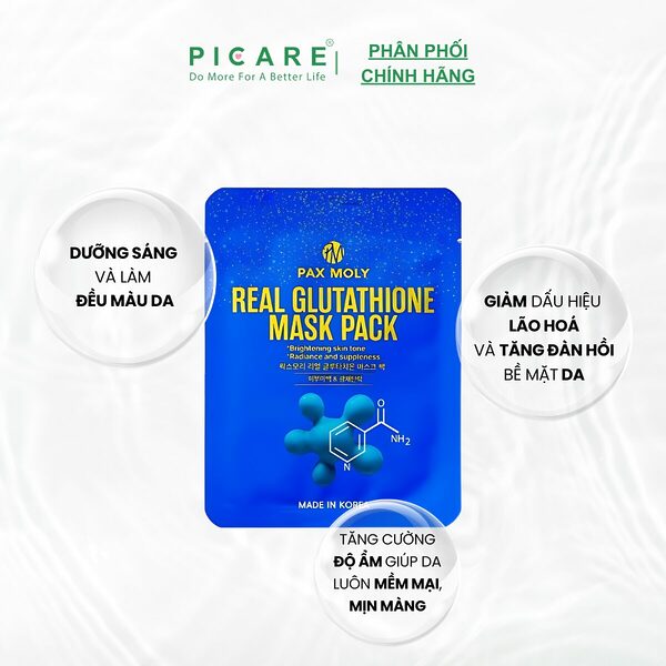 – Mặt nạ Pax Moly Real Glutathione Mask Pack nổi bật với thành phần chính là Glutathione có khả năng cấp ẩm, hỗ trợ dưỡng trắng, giúp da luôn ẩm mượt. Đồng thời, Glutathione còn có tác dụng tăng cường độ đàn hồi, cho làn da căng mịn.