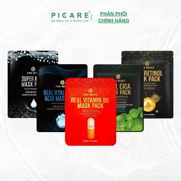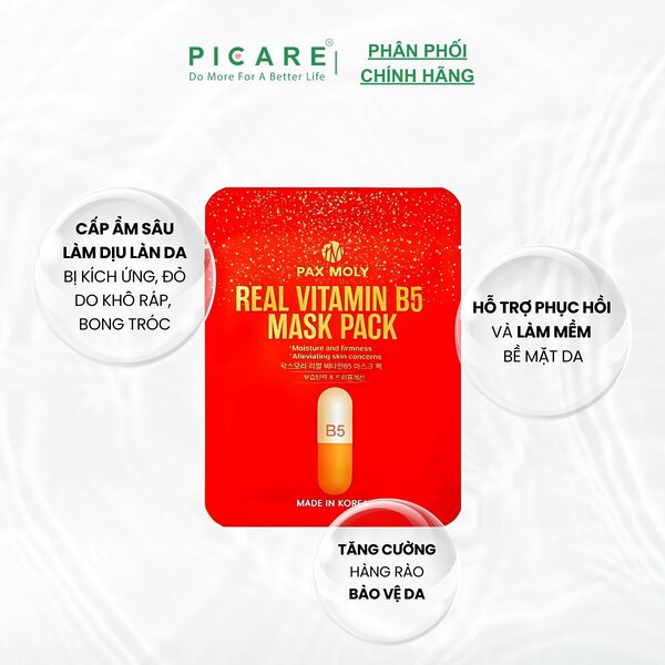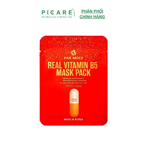 – Mặt nạ Pax Moly Real Vitamin B5 Mask Pack nổi bật với thành phần chính là vitamin B5 có khả năng giữ nước giúp da luôn ẩm mượt. Đồng thời, Vitamin B5 còn có tác dụng làm dịu da, giảm viêm.