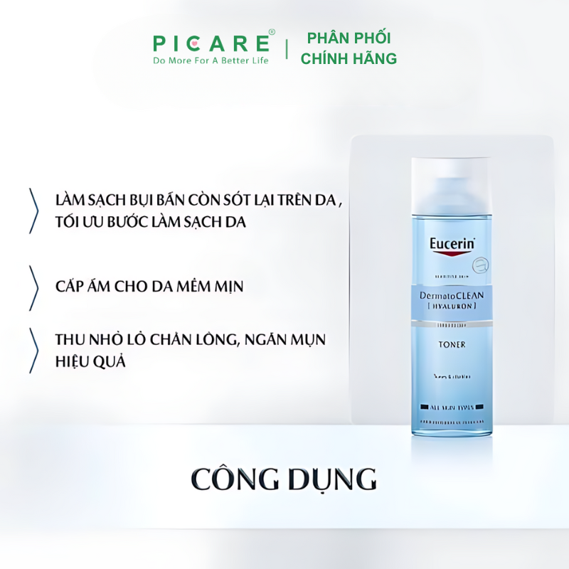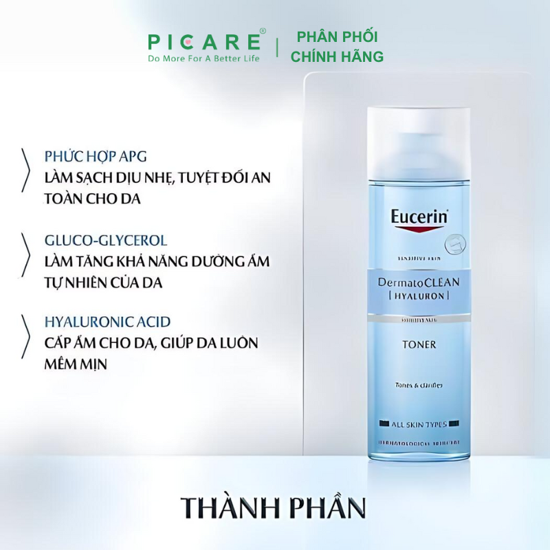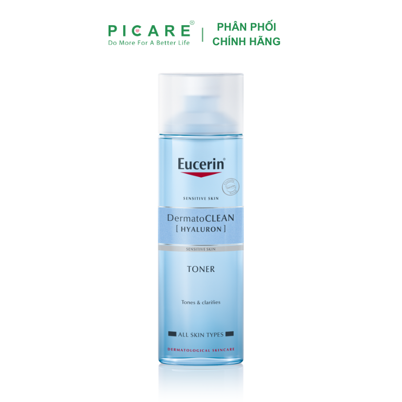 Nước hoa hồng cân bằng dành cho da nhạy cảm Eucerin DermatoCLEAN Hyaluron Toner giúp nhẹ nhàng làm sạch sâu bụi bẩn và bã nhờn còn sót lại trên da và cân bằng độ ẩm cho da. Đồng thời, với Hyaluronic Acid, sản phẩm còn cấp ẩm cho làn da sau bước làm sạch. Không bổ sung hương liệu – Picare là nhà phân phối chính hãng của Eucerin tại Việt Nam.