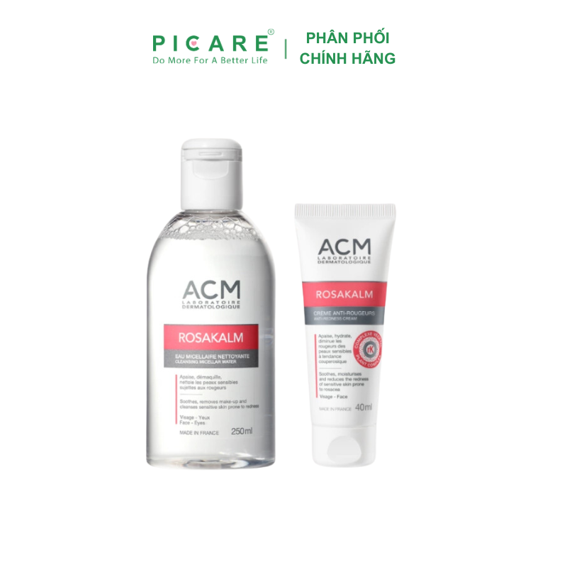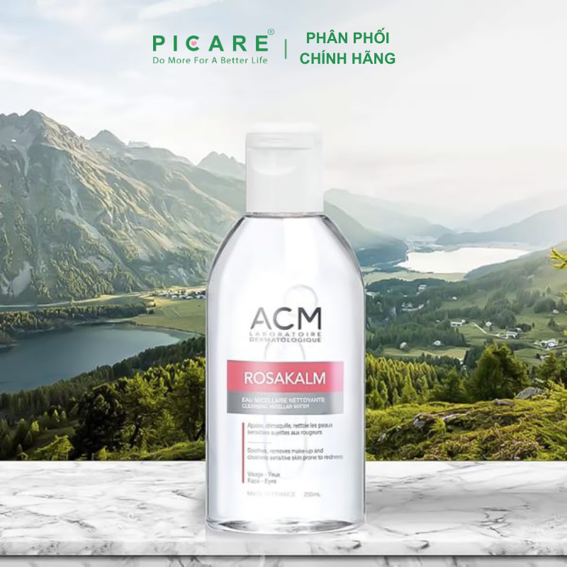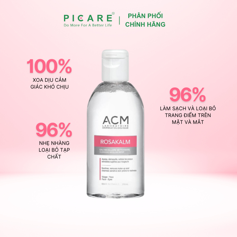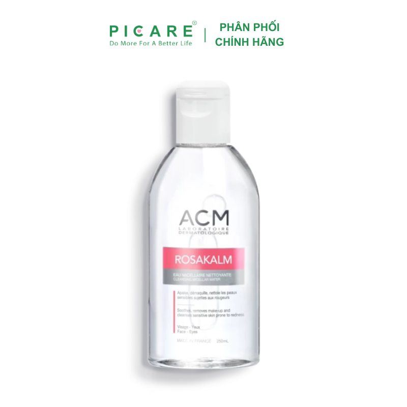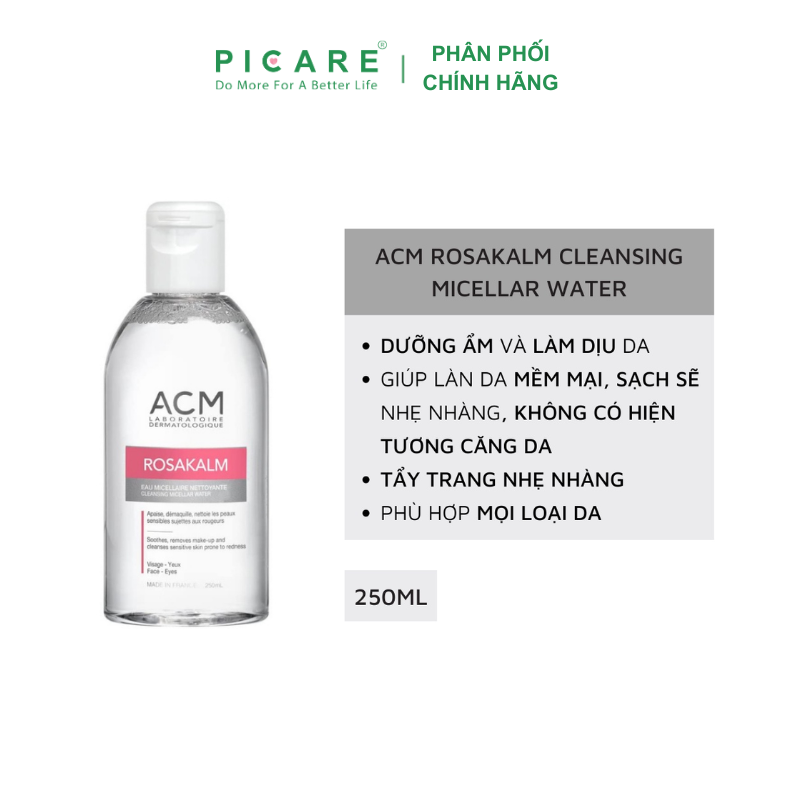 Nước tẩy trang cho da nhạy cảm ACM Rosakalm Cleansing Micellar Water là sản phẩm nước tẩy trang 3 trong 1 với tính năng: Làm sạch, loại bỏ lớp trang điểm và làm dịu làn da mà không cần rửa lại bằng nước. Sản phẩm tẩy trang dạng nước sử dụng được cho cả vùng mặt và mắt mang đến một làn da tươi mới sau khi sử dụng mà không làm khô da, phù hợp trên cả các làn da “khó tính” nhất như da nhạy cảm, dễ nổi mẫn đỏ.-Picare là nhà phân phối chính hãng của ACM tại Việt Nam.
