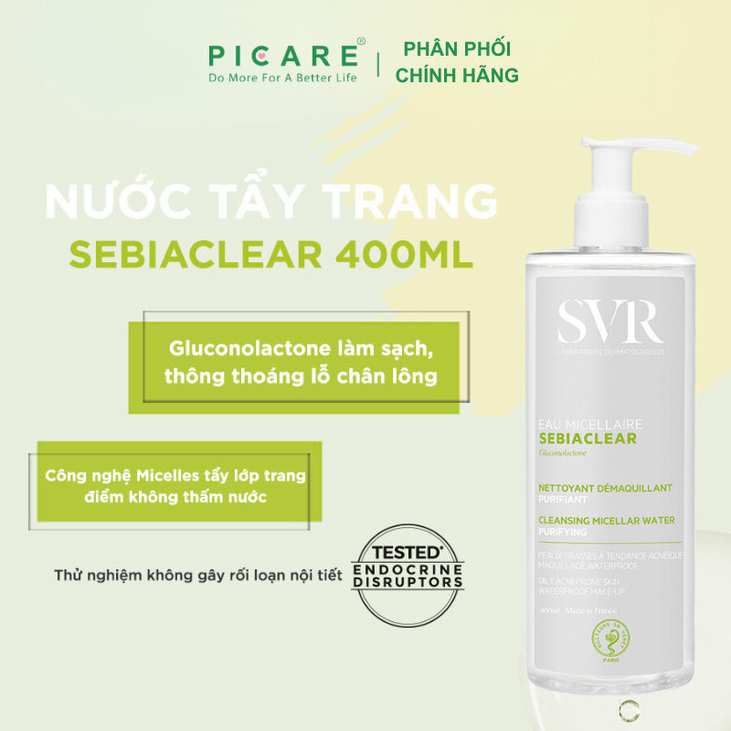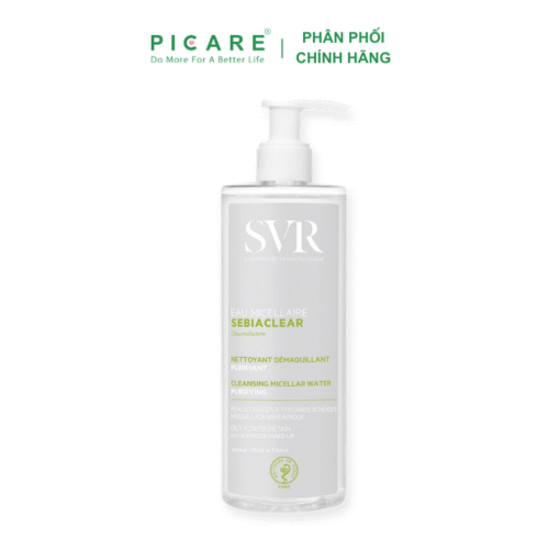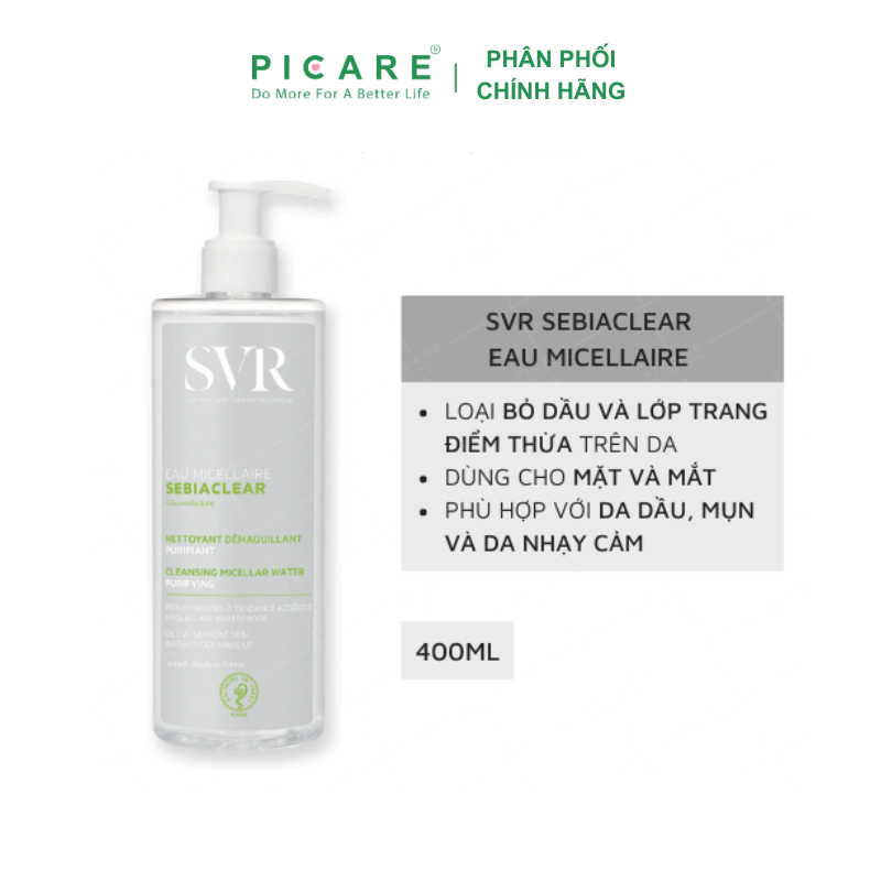 Nước tẩy trang làm sạch và loại bỏ dầu Eau Micellaire 400ml giúp làm sạch, rửa và tẩy lớp trang điểm chỉ trong 1 bước. Sản phẩm còn giúp loại trừ cặn bẩn và bã nhờn dư thừa mà không làm khô da, giúp làn da sạch và tươi mát. Sản phẩm dành cho da hỗn hợp đến da dầu và da mụn nhạy cảm. – Picare là nhà phân phối chính hãng của SVR tại Việt Nam.