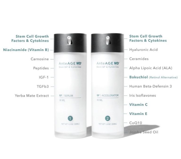 AnteAGE là dòng sản phẩm chứa các growth factor và cytokine nuôi cấy từ tế bào gốc tủy xương. Sản phẩm dùng dạng serum, dung dịch lăn kim chuyên dụng, và một số chế phẩm hỗ trợ trẻ hóa. Thành phần thường gặp gồm hyaluronic acid, peptit tái tạo, một số bảo quản như benzyl alcohol và dehydroacetic acid. Các yếu tố này đóng vai trò kích thích phục hồi da và giảm viêm.