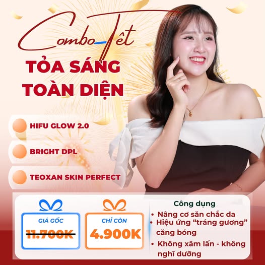 Combo Tết tỏa sáng toàn diện là lựa chọn hoàn hảo cho những cô nàng muốn nâng tông da, làm mờ dấu mệt mỏi và có gương mặt rạng rỡ mà không phải chịu những can thiệp xâm lấn hay mất nhiều thời gian nghỉ dưỡng. Giải pháp này giúp bạn kịp tự tin trước những buổi gặp gỡ, chúc Tết và tạo ấn tượng đầu năm ngay tức thì.