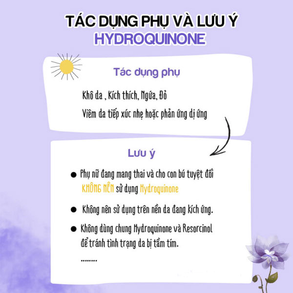 - Một số lo ngại về độ an toàn của hydroquinone trên da đã được công bố, nhưng các nghiên cứu về việc sử dụng hydroquinone ngoài da đã chỉ ra rằng các tác dụng không mong muốn là rất nhỏ và là hậu quả của việc sử dụng ở nồng độ quá cao hoặc do việc sử dụng kết hợp với các hoạt chất khác như glucocorticoid hoặc thủy ngân iodine.