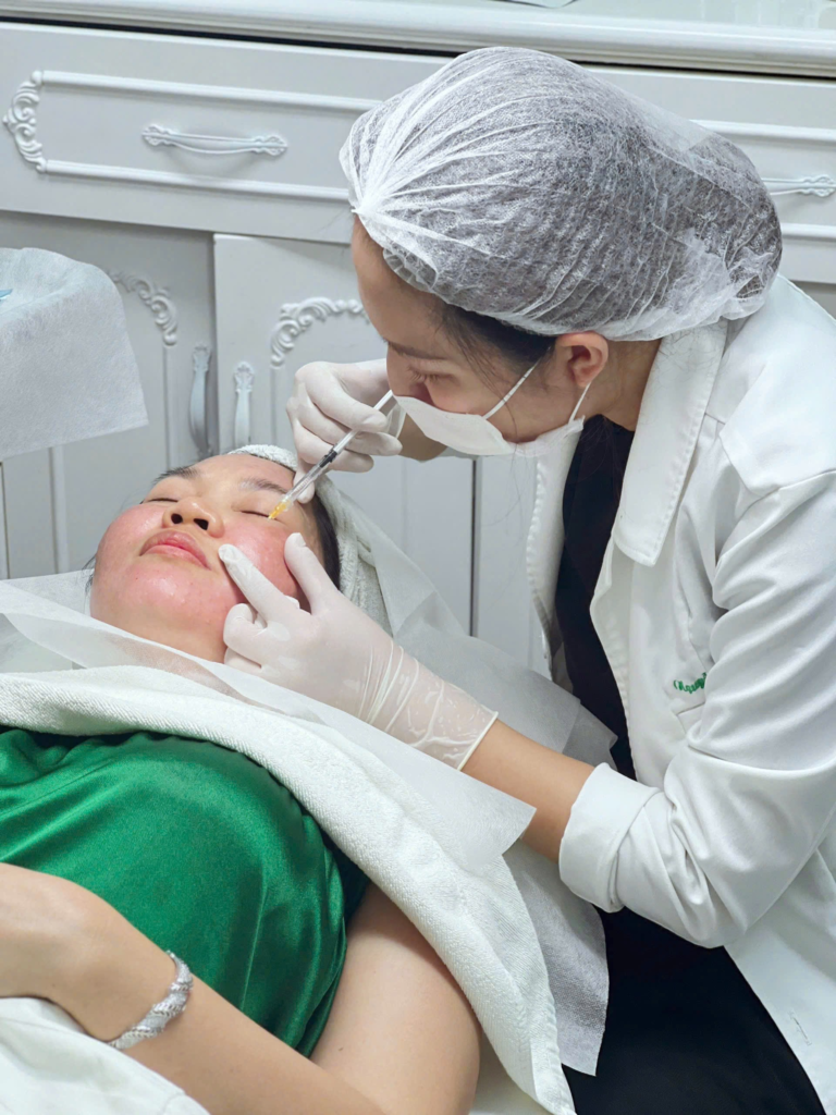 - Tiêm chất điều trị: Bác sĩ sử dụng kim rất nhỏ để đưa dung dịch giàu dưỡng chất vào lớp trung gian của da theo kỹ thuật chuẩn, đảm bảo lượng và độ sâu của mũi tiêm chính xác.