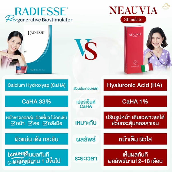 Neauvia Stimulate là một loại filler kết hợp HA và CaHA. Sản phẩm này dùng HA được cross-link bởi PEG và thêm CaHA để kích thích collagen. Radiesse là filler dựa trên CaHA thuần túy. Radiesse dùng hạt vi thể CaHA phân tán trong gel mang. Cả hai đều giúp tăng thể tích. Cơ chế chính khác nhau giữa làm đầy tức thì và kích thích mô lâu dài.