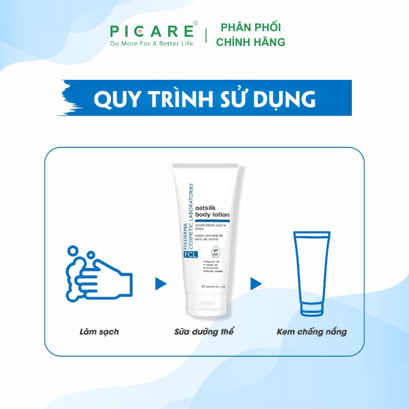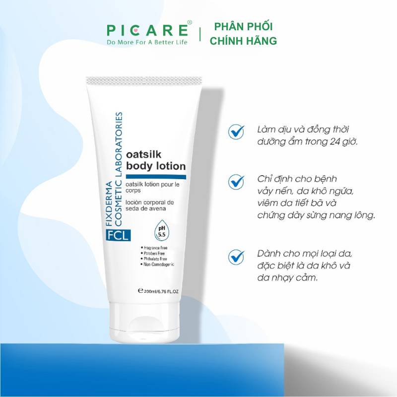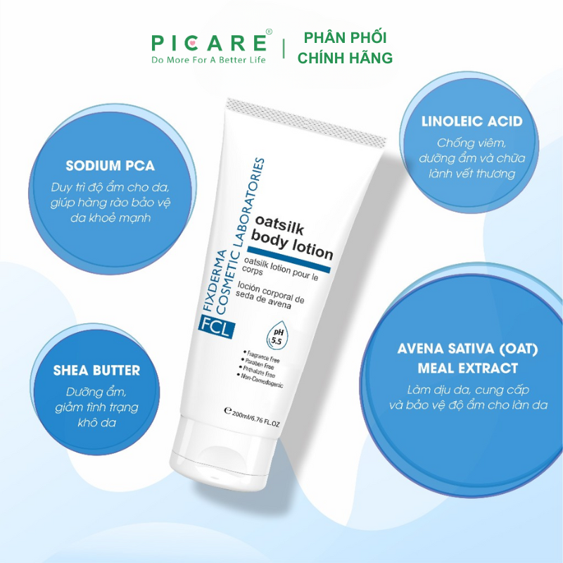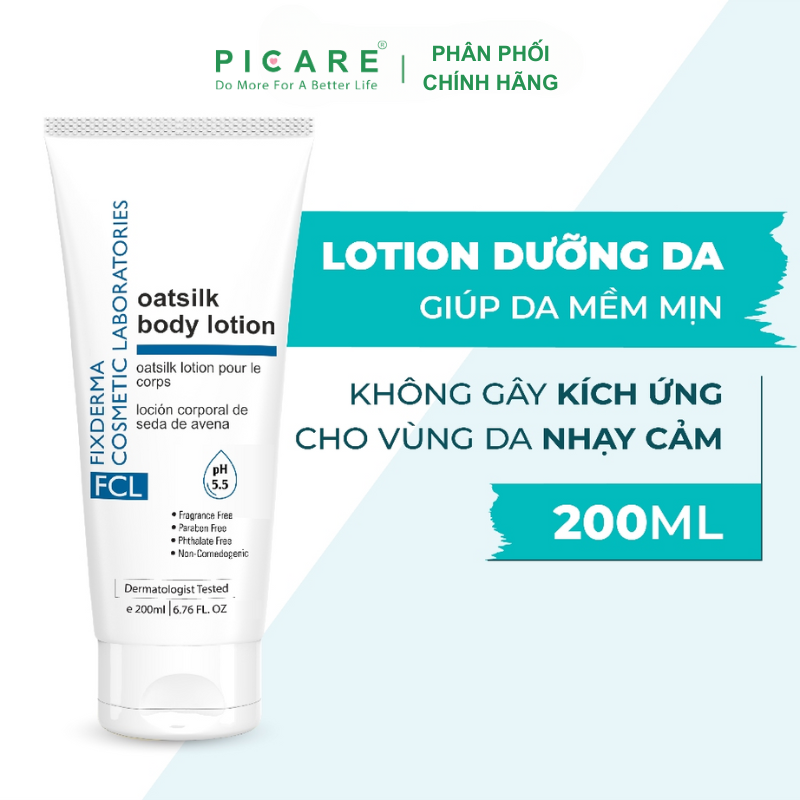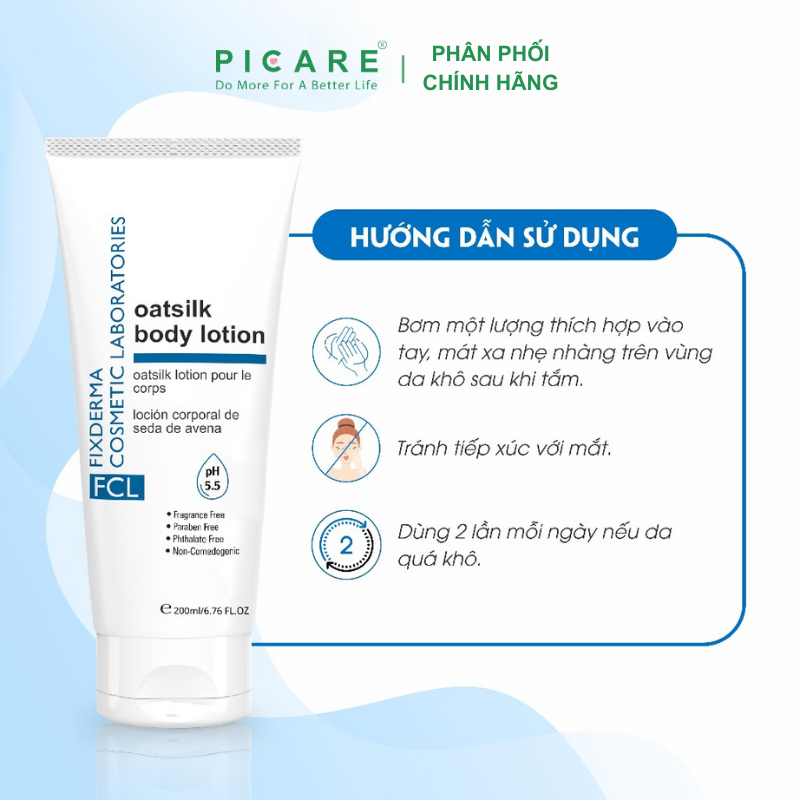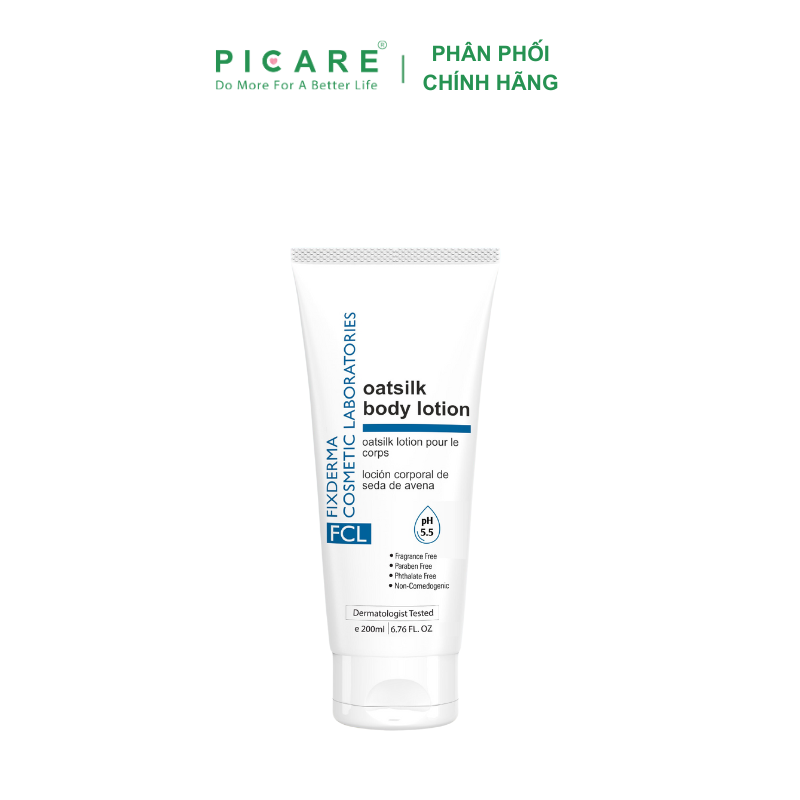 FCL Oat Silk Body Lotion dưỡng ẩm, cân bằng độ ẩm cho da, giúp duy trì sự khỏe mạnh và sức sống của da (đặc biệt thích hợp cho da khô). Không gây kích ứng cho làn da nhạy cảm. – Picare là nhà phân phối chính hãng của Fixderma tại Việt Nam.