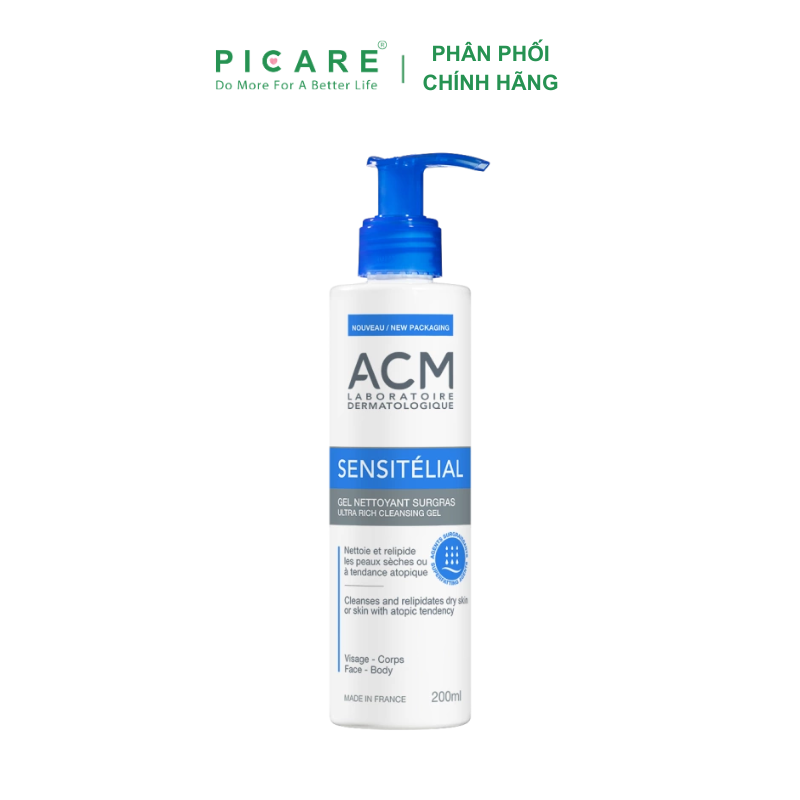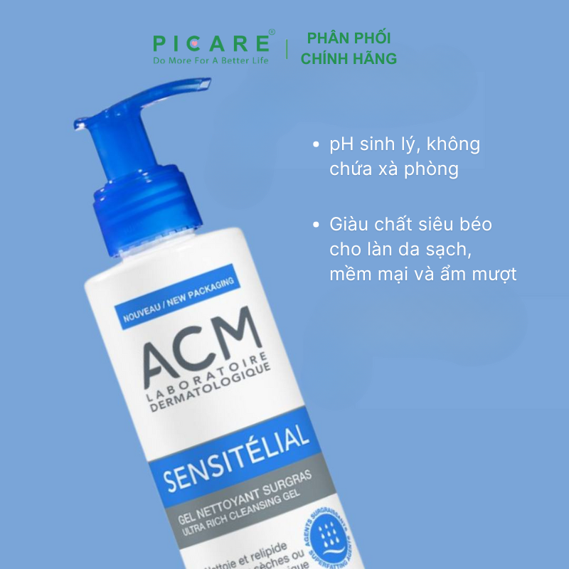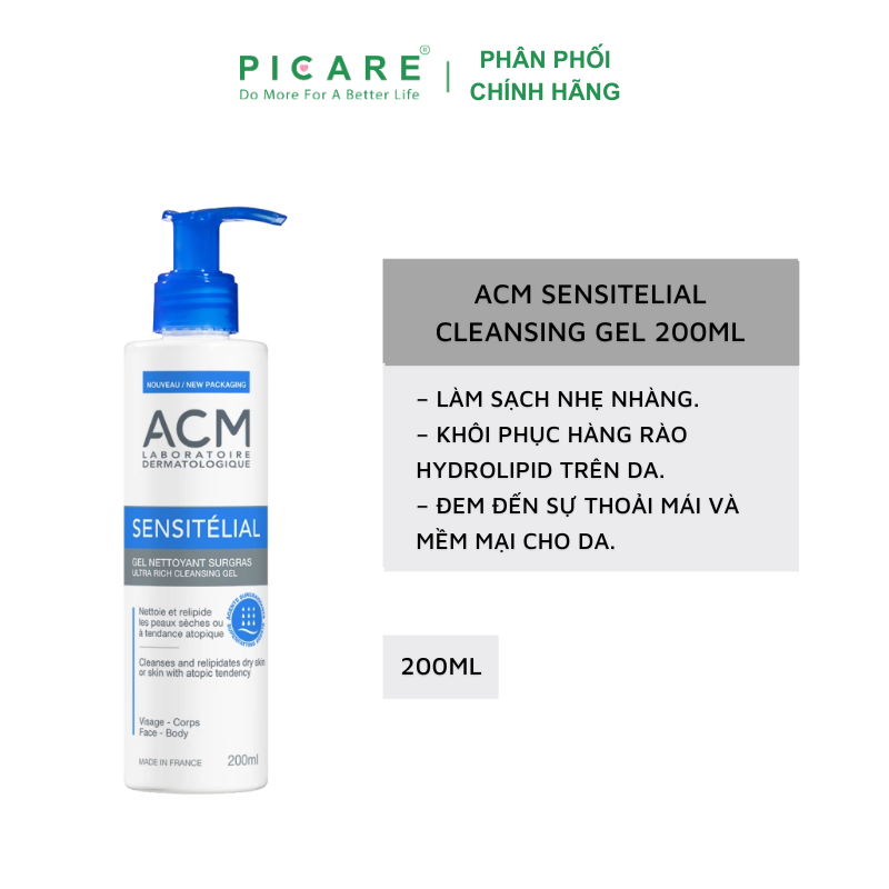 Sữa rửa mặt ACM Sensitelial Cleansing 200ml giúp loại bỏ tế bào chết, giúp da mịn màng tươi sáng. Ngoài ra, nó không chứa hương liệu, phù hợp với làn da khô và nhạy cảm. Sản phẩm giúp loại bỏ các tạp chất một cách nhẹ nhàng và không làm khô da. Sản phẩm chứa chất làm mềm da, đem lại cảm giác nhẹ nhàng cho da mà không làm tổn hại đến hàng rào hydrolipid của da.- Picare là nhà phân phối chính hãng của ACM tại Việt Nam.
