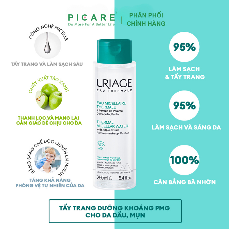 Tẩy Trang Dưỡng Khoáng Pmg Cho Da Dầu, Mụn Uriage Eau Micellaire Thermale Pmg 250ml nhờ có các tính năng dưỡng ẩm và làm dịu độc đáo của nước khoáng Uriage cùng với công nghệ hạt Micelle thế hệ mới giúp bẫy trọn bụi bẩn, tạp chất, dầu thừa và các lớp mỹ phẩm chống nắng, trang điểm giúp da sạch hoàn hảo và ngăn ngừa phát sinh mụn.– Picare là nhà phân phối chính hãng của URIAGE tại Việt Nam.