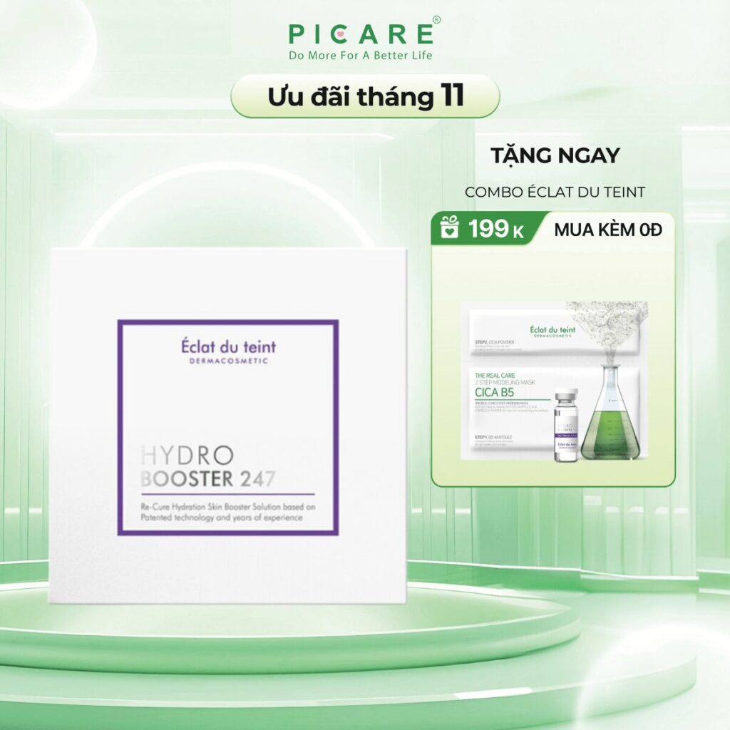 Serum cấp ẩm chuyên sâu hỗ trợ thúc đẩy tăng sinh tế bào Éclat du teint HYDRO BOOSTER 247 với 50.000ppm PDRN (Polydeoxyribonucleotide) cùng với phức hợp axit amin, phức hợp HA, phức hợp pedtid và các yếu tố tăng trưởng EGF, FGF là một chế phẩm cấp ẩm tối ưu vượt trội, phù hợp cho cả liệu trình của phương pháp MTS (Microneedling Therapy System – Liệu pháp vi kim). Dung tích 7ml vừa đủ cho cả vùng mặt và cổ.