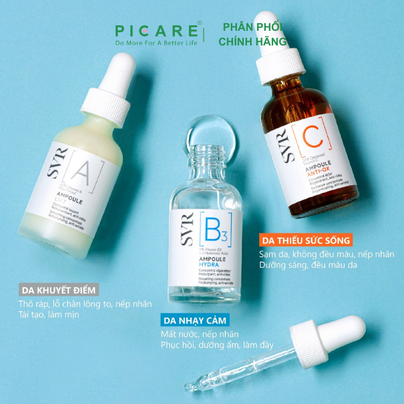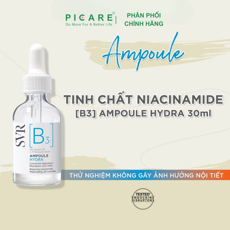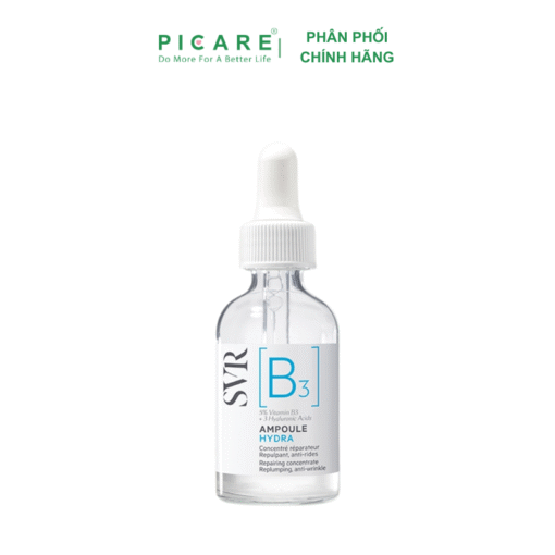 Tinh Chất Dưỡng Ẩm Căng Da SVR [B3] Ampoule Hydra 30ml với Vitamin B3 giúp làm dịu, thoải mái và cấp ẩm sâu cho da. Sản phẩm có kết cấu rất nhẹ và công thức đơn giản kết hợp 12 thành phần mạnh mẽ. Đầu tiên, nồng độ 5% của Vitamin B3 đảm bảo kết quả làm dịu, dưỡng ẩm và giảm lão hóa. Vitamin B3 cũng khuyến khích sản xuất collagen tự nhiên của da để làm mới làn da từ bên trong. Ngoài ra, ba loại Axit Hyaluronic khác nhau phục hồi độ ẩm và làm căng mọng làn da. Picare là nhà phân phối chính hãng của SVR tại Việt Nam.