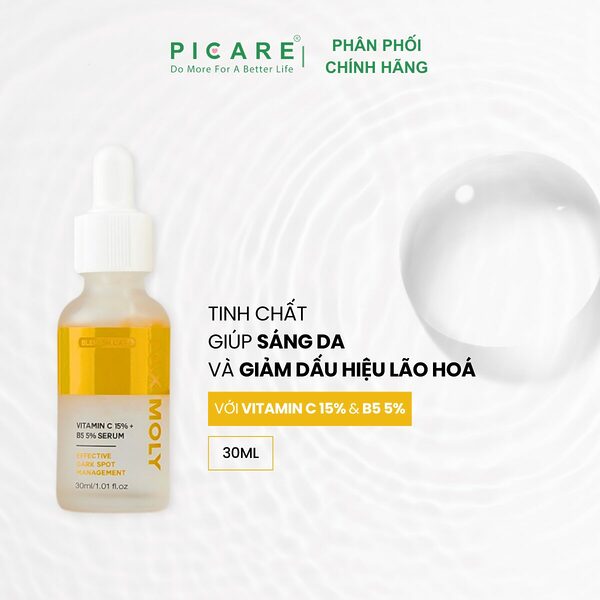 Tinh chất dưỡng da kết hợp Vitamin C 15% và B5 5% cải thiện sắc tố da, bảo vệ da, cấp ẩm và làm dịu da, cho làn da luôn mềm mịn, căng bóng.