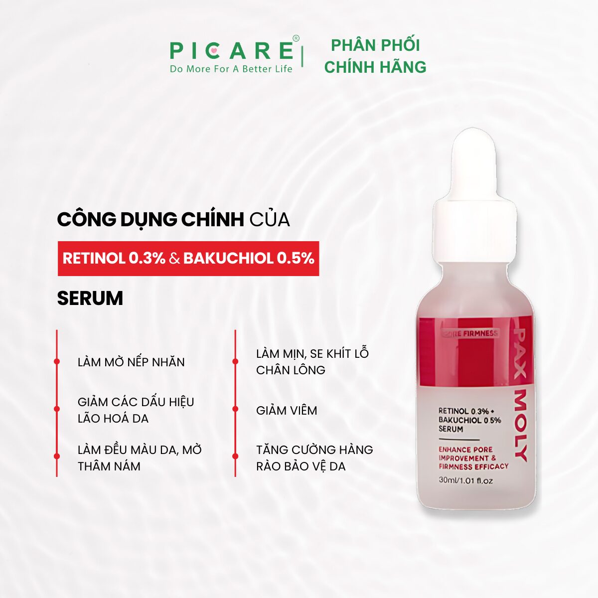 – Cải thiện độ đàn hồi: Retinol phục hồi độ đàn hồi cho da, làm cho da trở nên căng mịn hơn.