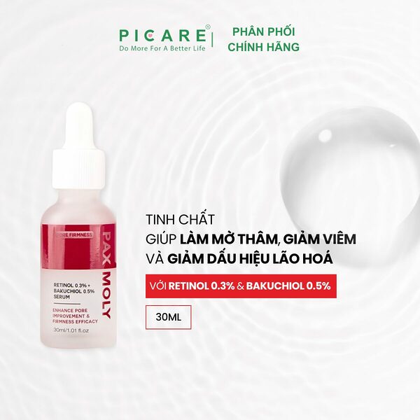 Tinh chất kết hợp Retinol 0.3% + Bakuchiol 0.5% Hỗ trợ làm mờ nếp nhăn và tăng độ đàn hồi. Cải thiện kết cấu ,đều màu da, thu nhỏ lỗ chân lông, giúp da mịn màng và làm mờ thâm, giảm khuẩn, làm dịu da bị mụn.Tăng cường hàng rào bảo vệ da, ngăn ngừa lão hóa sớm.