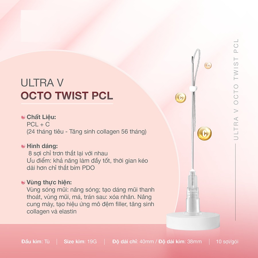Sản phẩm ULTRA V OCTO TWIST PCL sử dụng sợi PCL (Polycaprolactone), một loại sợi hấp thụ tự nhiên trong cơ thể, để tạo độ căng cho da và kích thích sự sản xuất collagen, giúp da trở nên săn chắc và mịn màng mà còn cải thiện tình trạng da lão hóa, nám da và nếp nhăn. Đặc biệt, thiết kế 8 chấu xoắn độc đáo giúp tăng cường hiệu quả nâng cơ và tái tạo da.