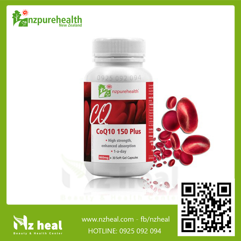 Viên uống bảo vệ tim mạch NZPurehealth CoQ10 150 Plus có chứa Co-enzyme Q10 giúp duy trì hệ tim mạch khỏe mạnh, tuần hoàn ổn định lâu dài, tăng cường máu tới cơ tim, phòng ngừa và làm giảm các bệnh tim mạch như đau thắt ngực, cao huyết áp, viêm cơ tim, suy tim,…