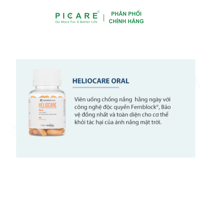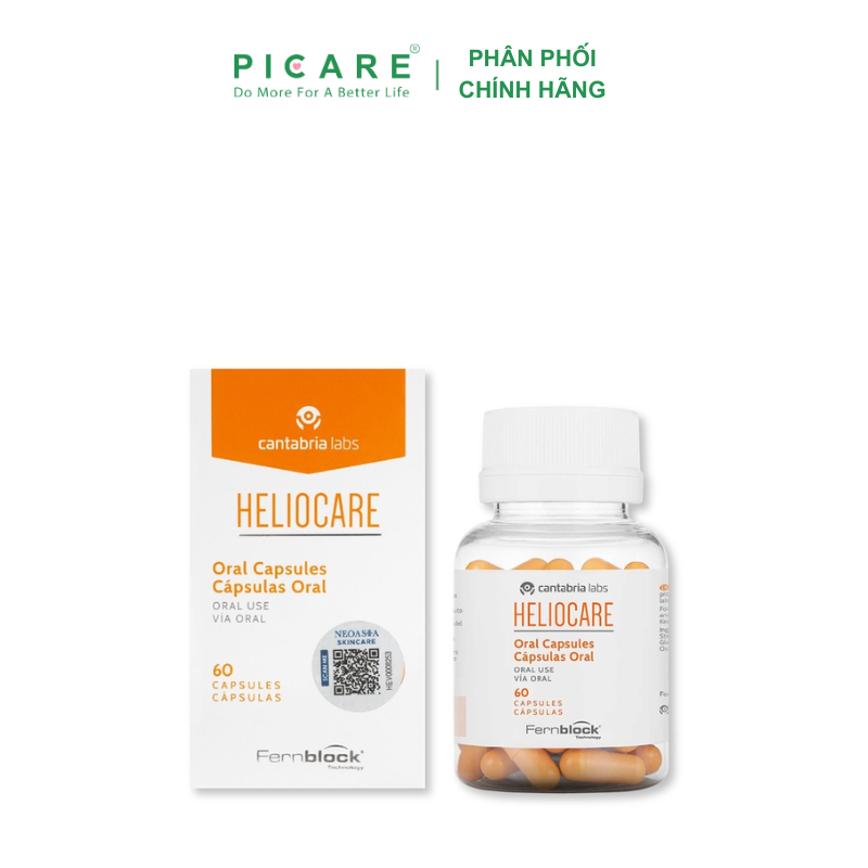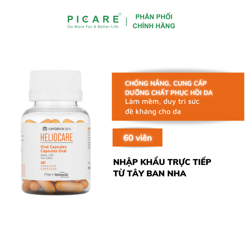 Viên Uống Chống Nắng Heliocare Oral 60 Viên chứa thành phần chống oxi hóa cao, kết hợp kem chống nắng, bảo vệ tối đa cho da bạn từ trong ra ngoài cho bạn tự tin với ngày dài năng động.– Picare là nhà phân phối chính hãng của HELIOCARE tại Việt Nam.