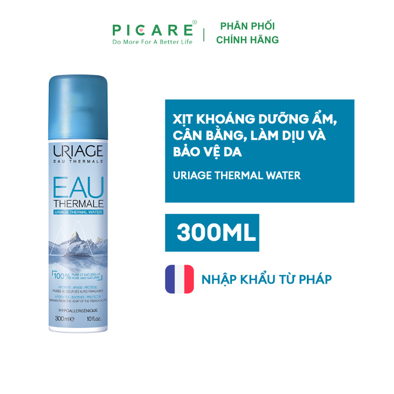 Xịt Khoáng Cấp Ẩm Uriage Thermal Water 300ml là xịt khoáng chứa 100% tinh khiết và tự nhiên. Nhờ vào hàm lượng muối khoáng cao tương tự như NMF của da (các chất dưỡng ẩm tự nhiên) và hàm lượng CanXi và Magiê cao, Uriage Thermal Water không những giúp dưỡng ẩm, khôi phục Hàng rào vật lý bảo vệ da mà còn làm dịu, tăng cường hàng rào miễn dịch của da, giúp giảm viêm và bảo vệ, tái cân bằng Hàng rào vi sinh vật bằng cách giảm độ bám dính và độc lực của vi khuẩn.– Picare là nhà phân phối chính hãng của URIAGE tại Việt Nam.